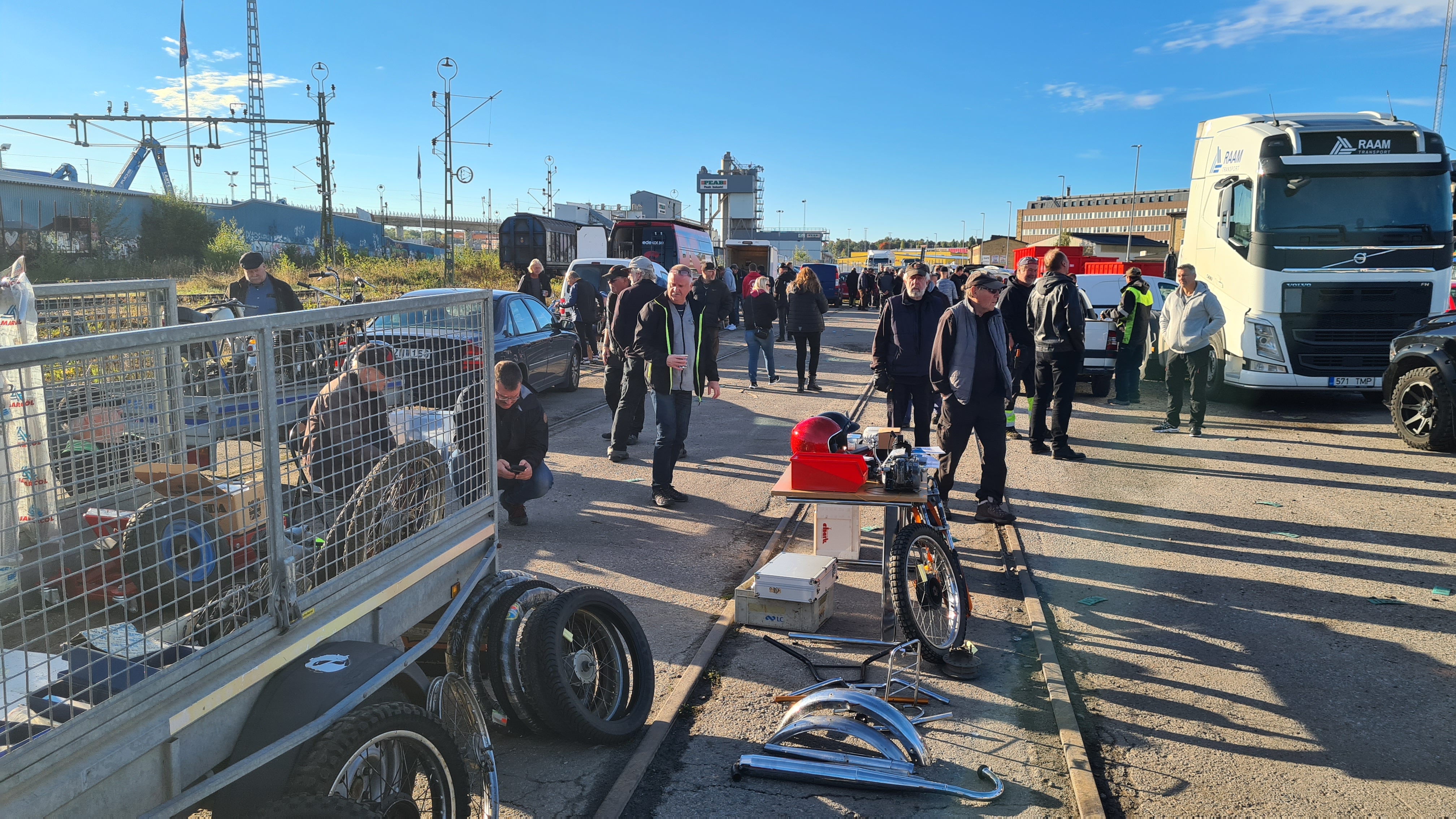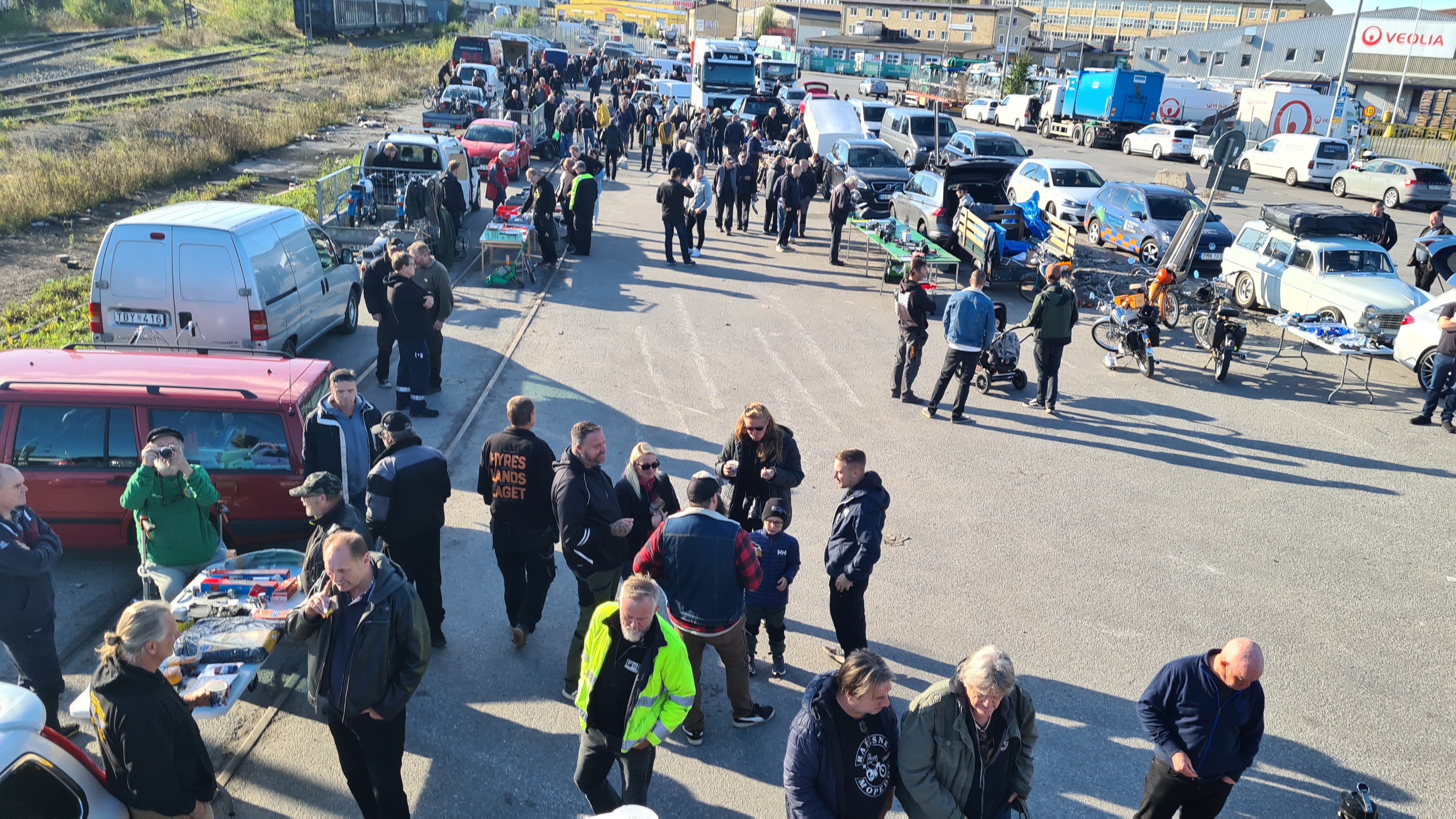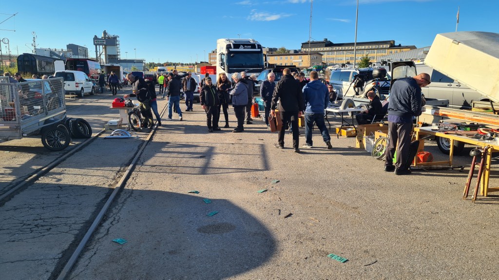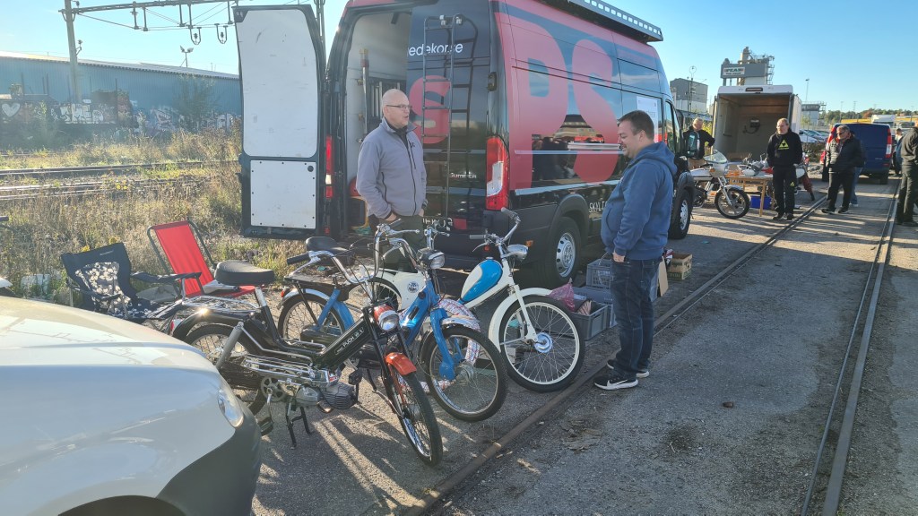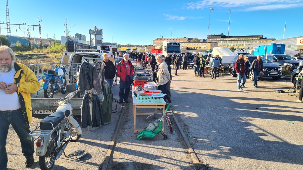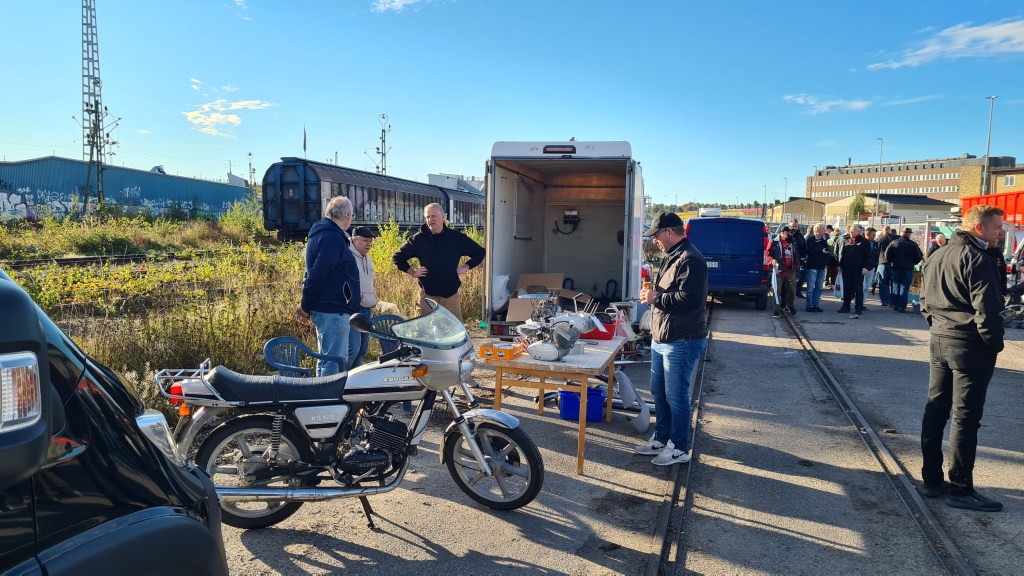 I strålande solsken så arrangerade vi för första gången på länge den i år rätt så välbesökta Moppisen. I år så höll vi Moppisen på ett annat ställe än under Liljeholmsbron, efter några års bråkande med ett p-bolag. Istället valde vi Västberga Industriområde där vi känner oss hemma och på ett utrymme som tidigare var SJ´s Frilastområde och som idag används sporadiskt för omlastningar. Vi gjorde som vi brukar; vi sätter en plats, ett datum och en tid, det är allt, resten ordnar de som vill sälja eller handla och de placerar sig där de vill.
