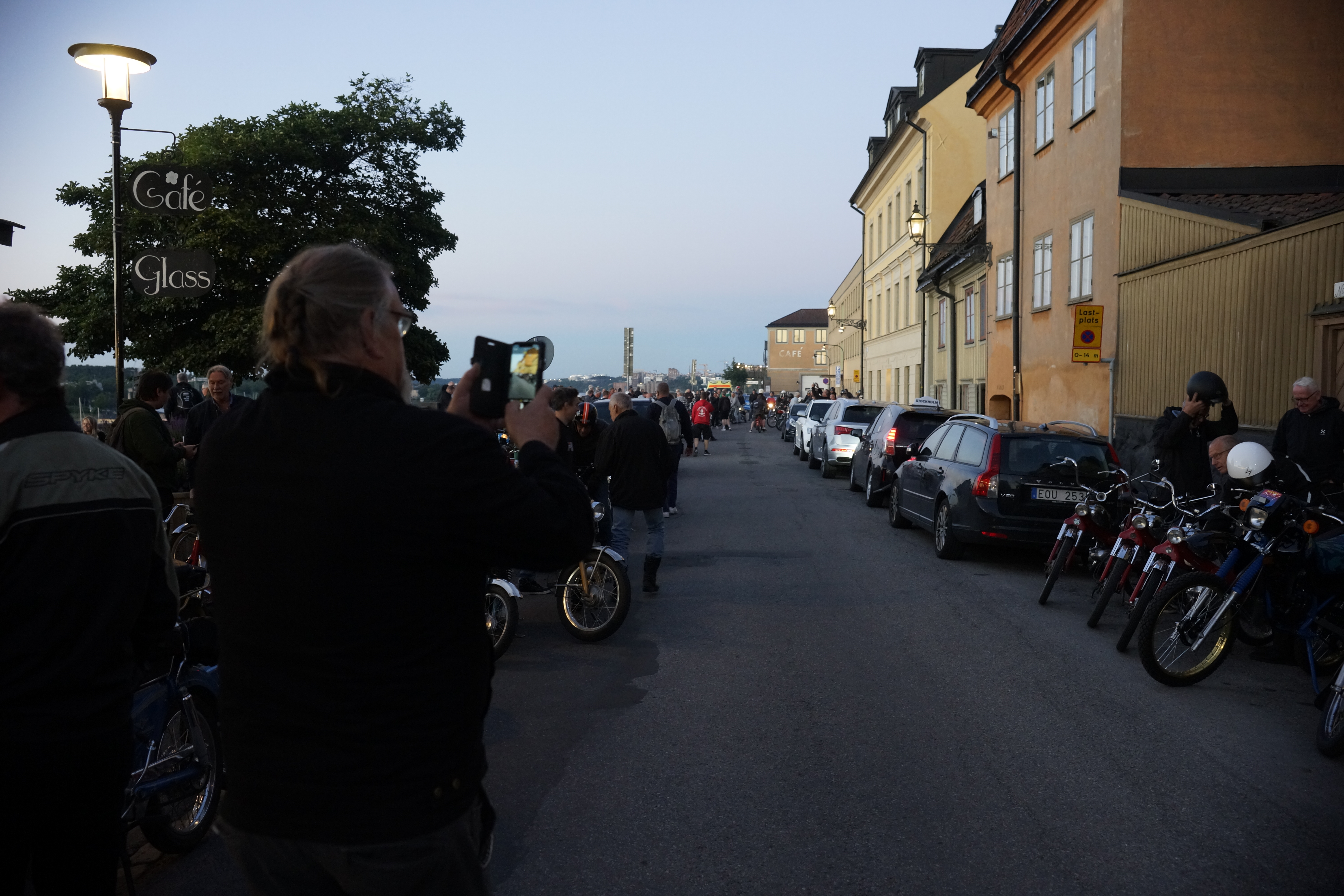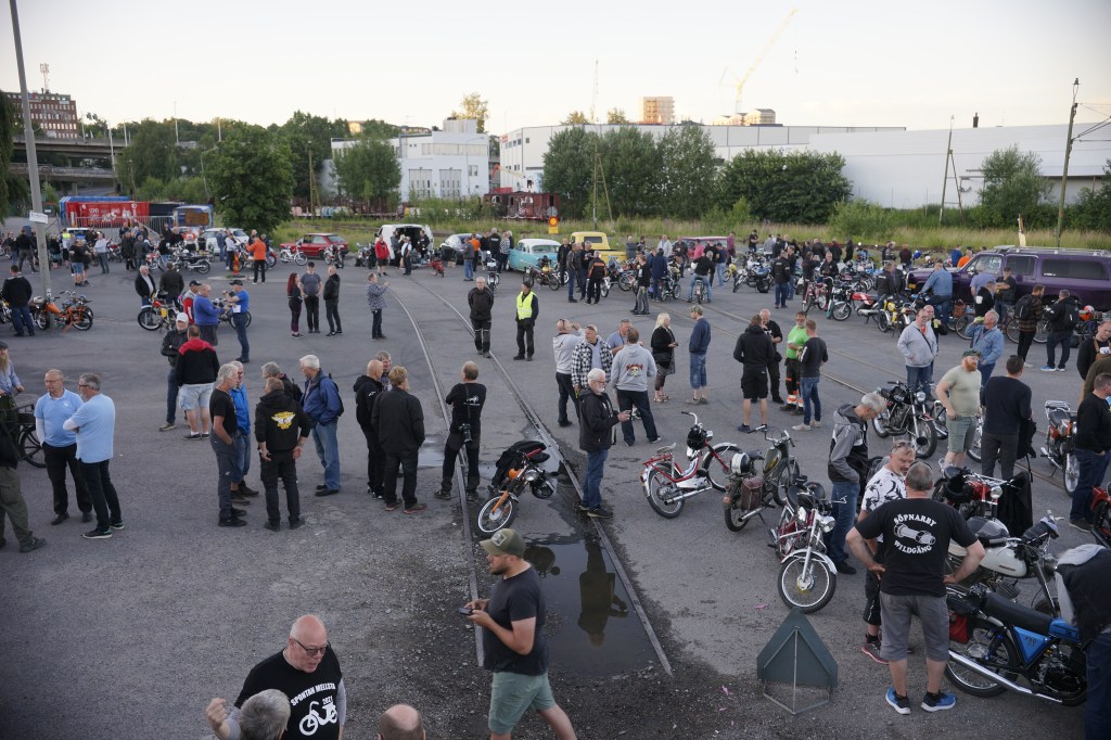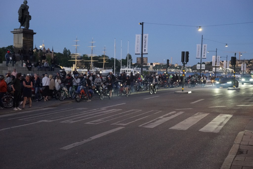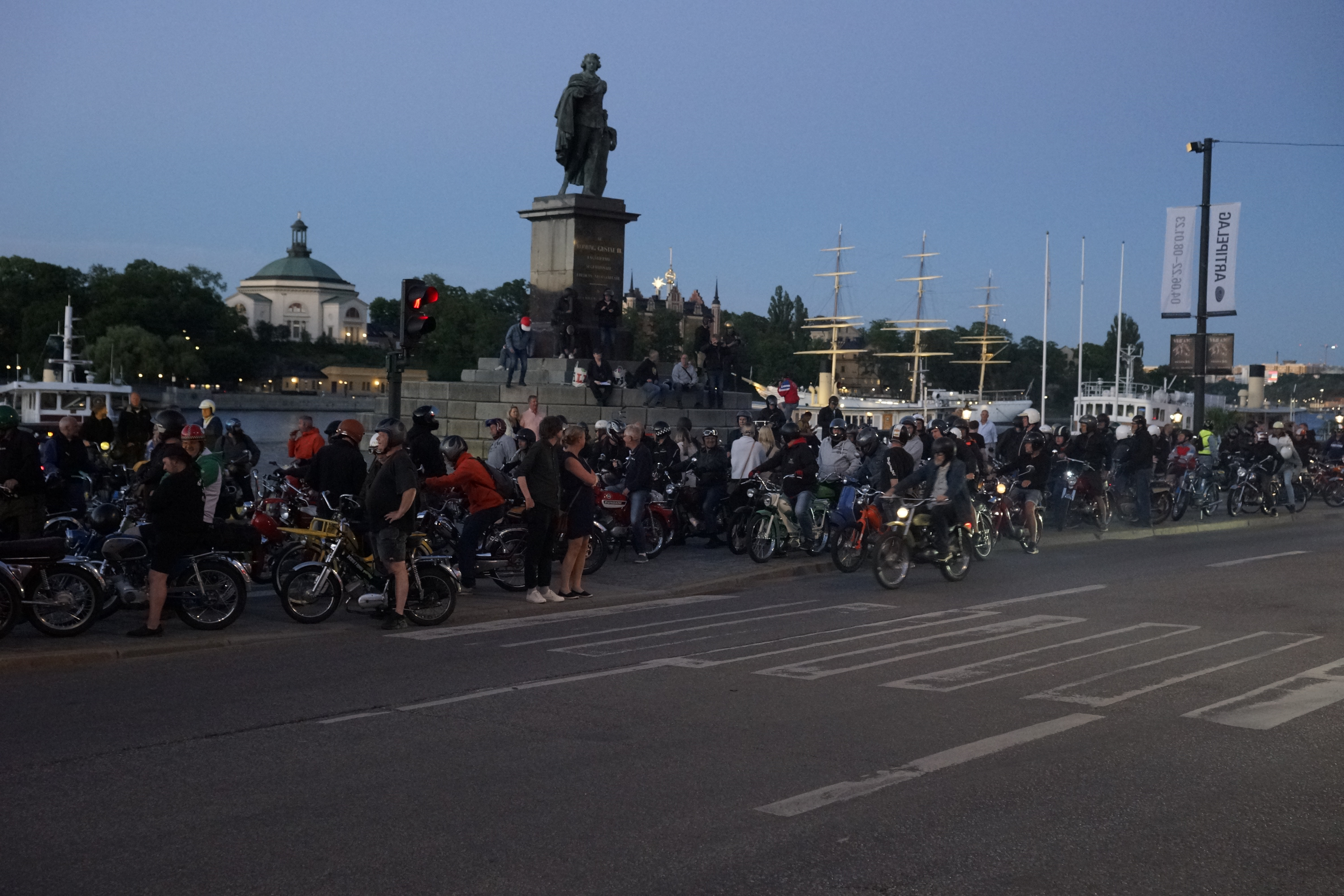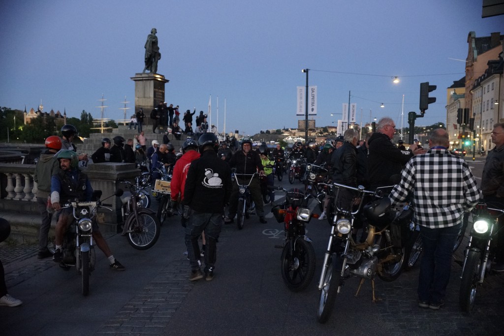 Vi ville köra på så får cykelvägar som möjligt då det bara har ställt till problem de senaste åren, så mycket av rundan gick ute på gatan men det fanns nålsögon att passera typ två ”bussfällor”. Det här fungerade bra trots alla trafikljus, men det gjorde även att rundan gick betydligt fortare än vi hade tänkt, trots flera långa uppsamlingsstopp. Nästa år ska vi se över det här så rundan tar längre tid och går genom alla stadsdelarna. Sen det här med hur många som körde är ju en ständig fråga, men efter att ha fått olika resultat så räknade vi igen och kom fram till 307 moppar + Tårtans grabbar och några som kom till efter vägen. I stort fungerade rundan bra och vi fick bara två små klotningar och en som åkte skamkärra från stan ut till Västberga. Många frågade varför vi startade i Västberga och inte under Liljeholmsbron, svaret är enkelt; markägaren vill inte ha den typen av verksamhet på sin mark, vi har försökt förhandla, tro oss…. Västberga är ju platsen vi körde från de första 8 åren av Midnattsruset och där vi även håller våra Moppisar, så det är hemtamt, samtidigt som vi har tillgång till el och vatten där. Ett stort tack till alla som kom och förgyllde vår runda och ett riktat tack till alla utsocknes som kom, det var närmare hälften av alla som åkte. Om gud vill och brallorna håller så kör vi Midnattsruset även 2023, så det så!