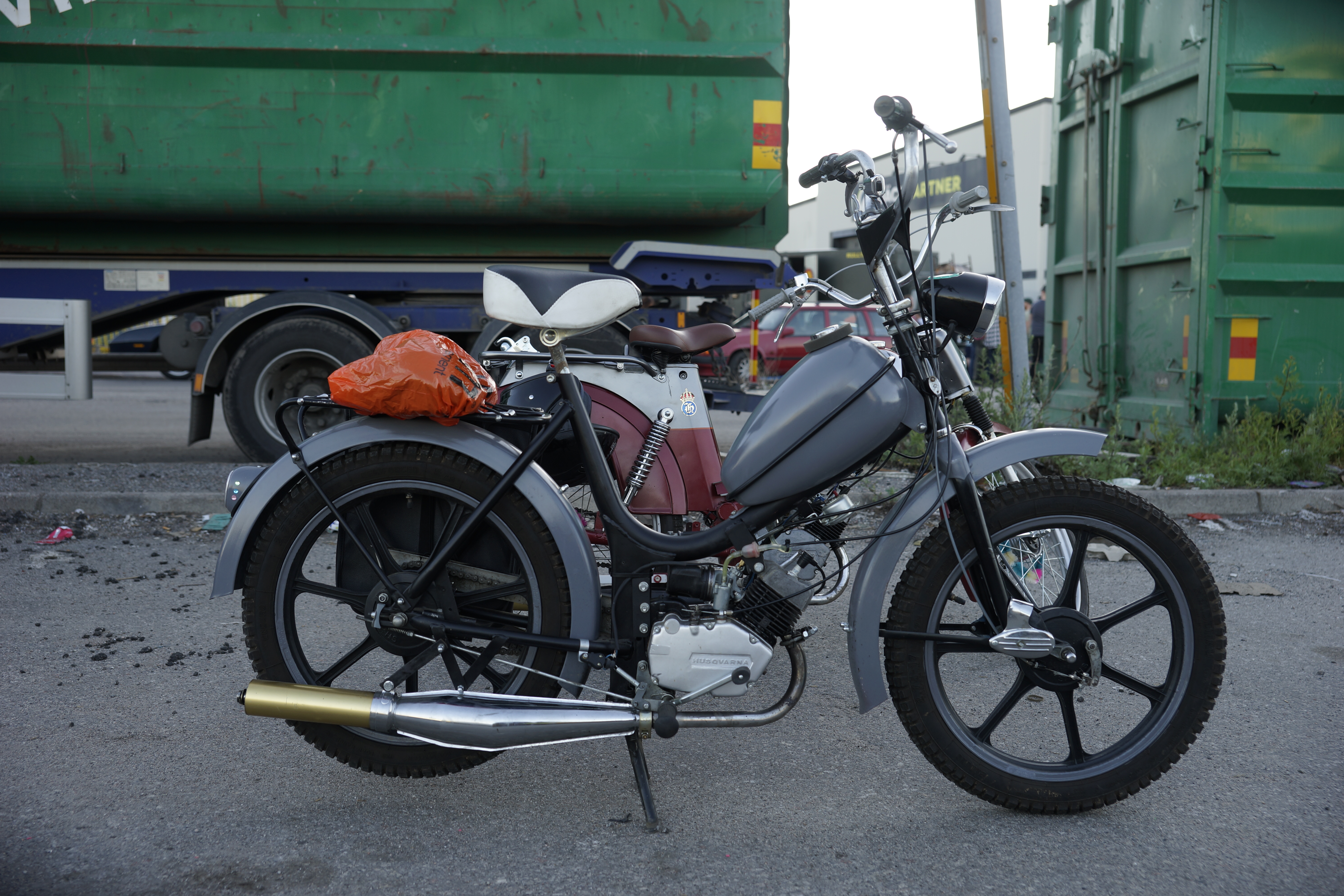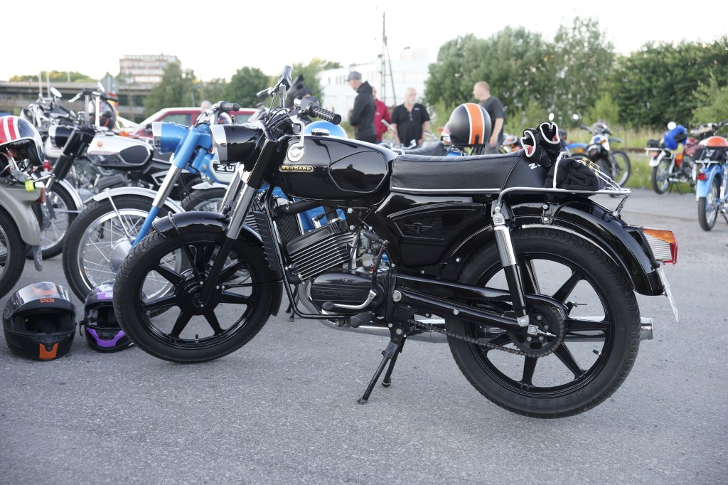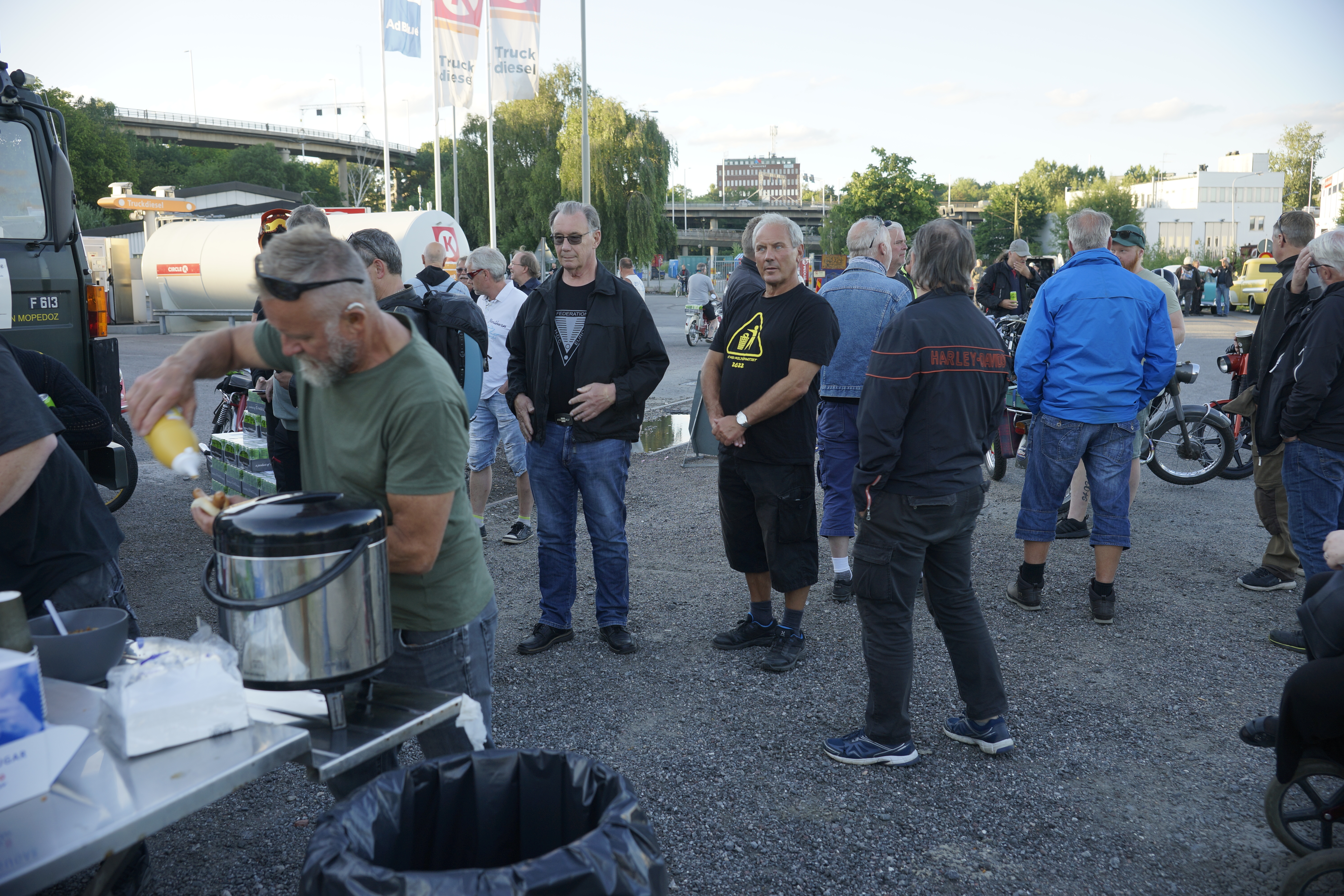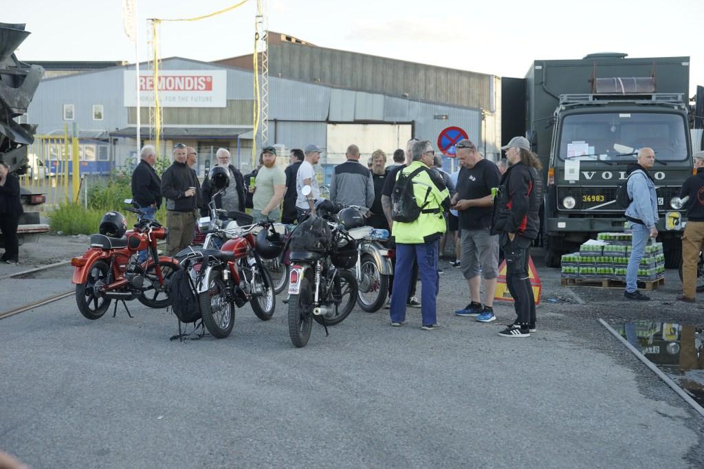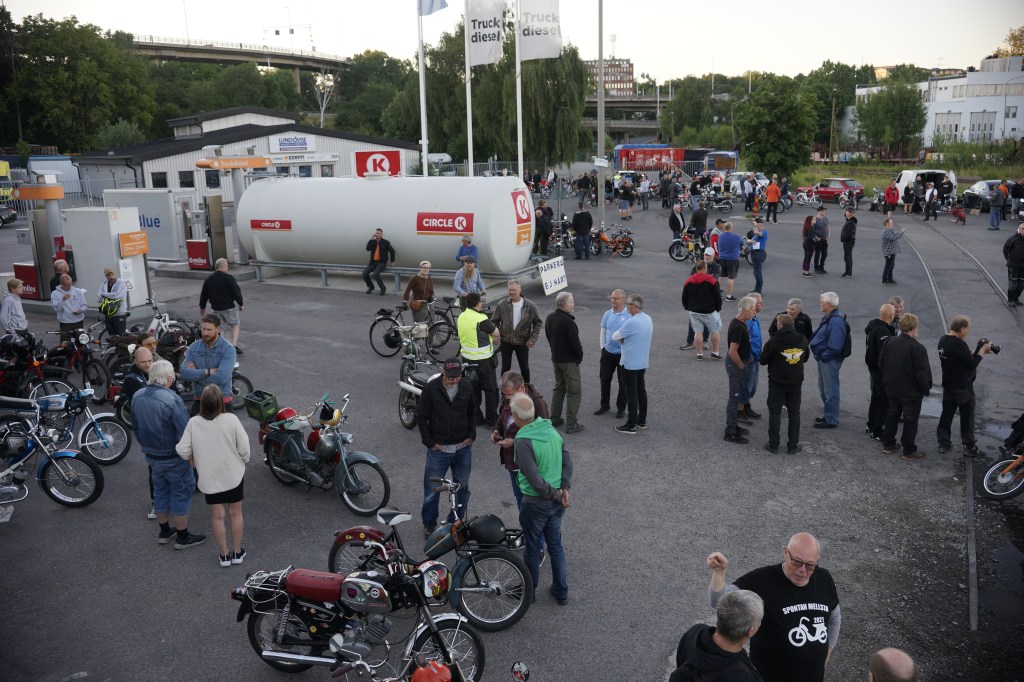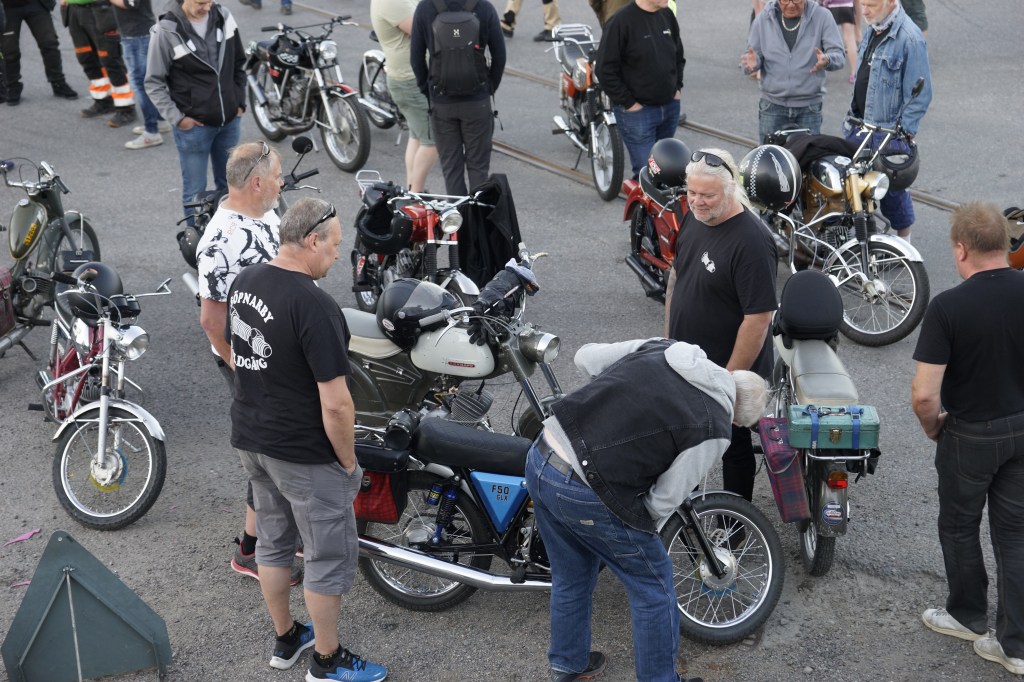 Vi ville köra på så får cykelvägar som möjligt då det bara har ställt till problem de senaste åren, så mycket av rundan gick ute på gatan men det fanns nålsögon att passera typ två ”bussfällor”. Det här fungerade bra trots alla trafikljus, men det gjorde även att rundan gick betydligt fortare än vi hade tänkt, trots flera långa uppsamlingsstopp. Nästa år ska vi se över det här så rundan tar längre tid och går genom alla stadsdelarna. Sen det här med hur många som körde är ju en ständig fråga, men efter att ha fått olika resultat så räknade vi igen och kom fram till 307 moppar + Tårtans grabbar och några som kom till efter vägen. I stort fungerade rundan bra och vi fick bara två små klotningar och en som åkte skamkärra från stan ut till Västberga. Många frågade varför vi startade i Västberga och inte under Liljeholmsbron, svaret är enkelt; markägaren vill inte ha den typen av verksamhet på sin mark, vi har försökt förhandla, tro oss…. Västberga är ju platsen vi körde från de första 8 åren av Midnattsruset och där vi även håller våra Moppisar, så det är hemtamt, samtidigt som vi har tillgång till el och vatten där. Ett stort tack till alla som kom och förgyllde vår runda och ett riktat tack till alla utsocknes som kom, det var närmare hälften av alla som åkte. Om gud vill och brallorna håller så kör vi Midnattsruset även 2023, så det så!