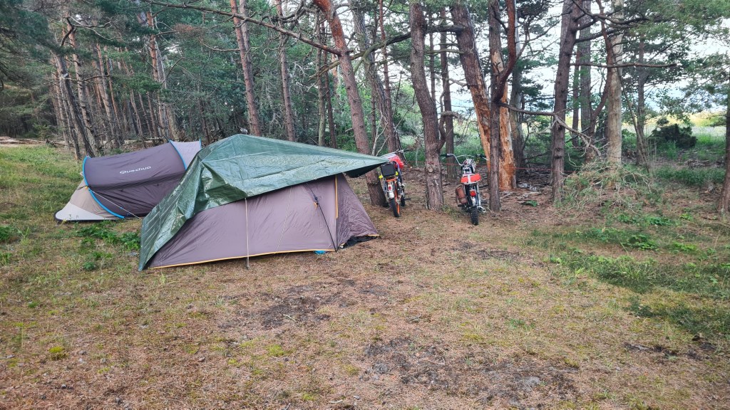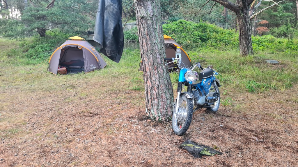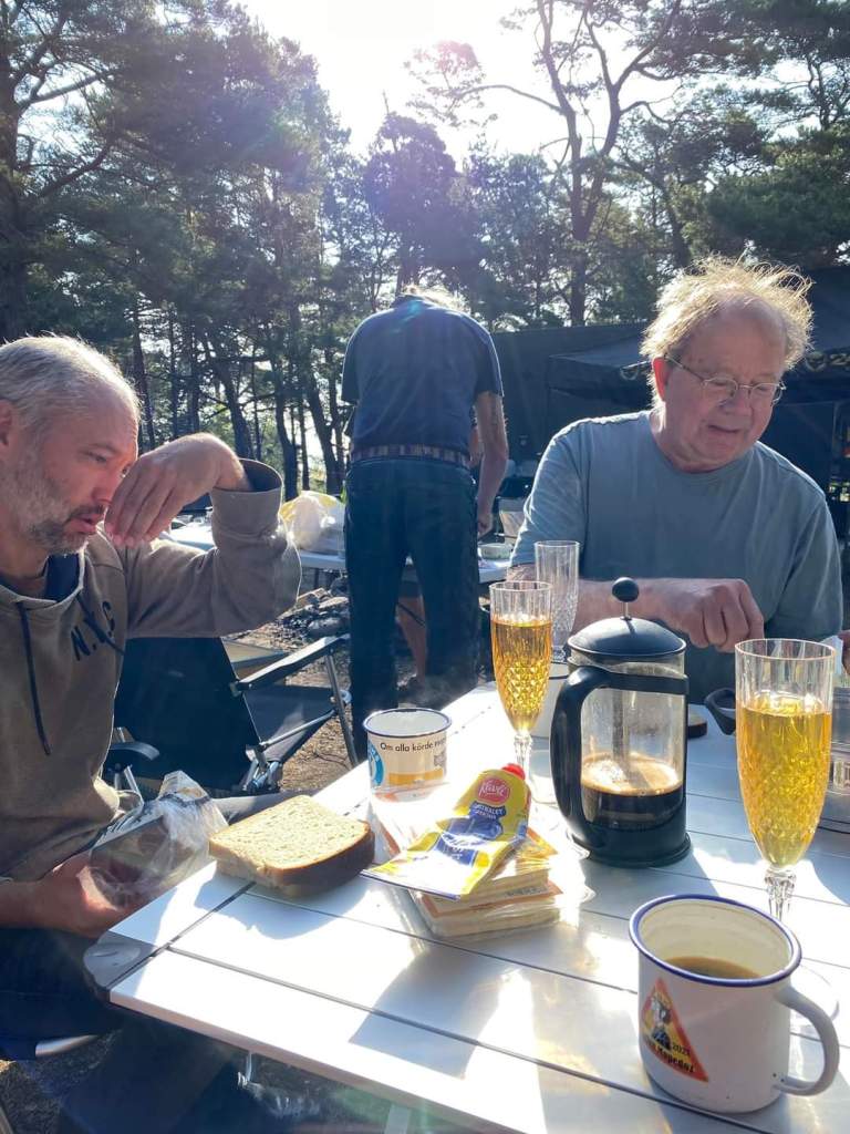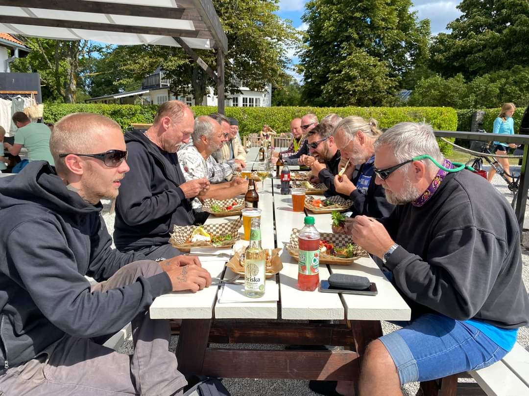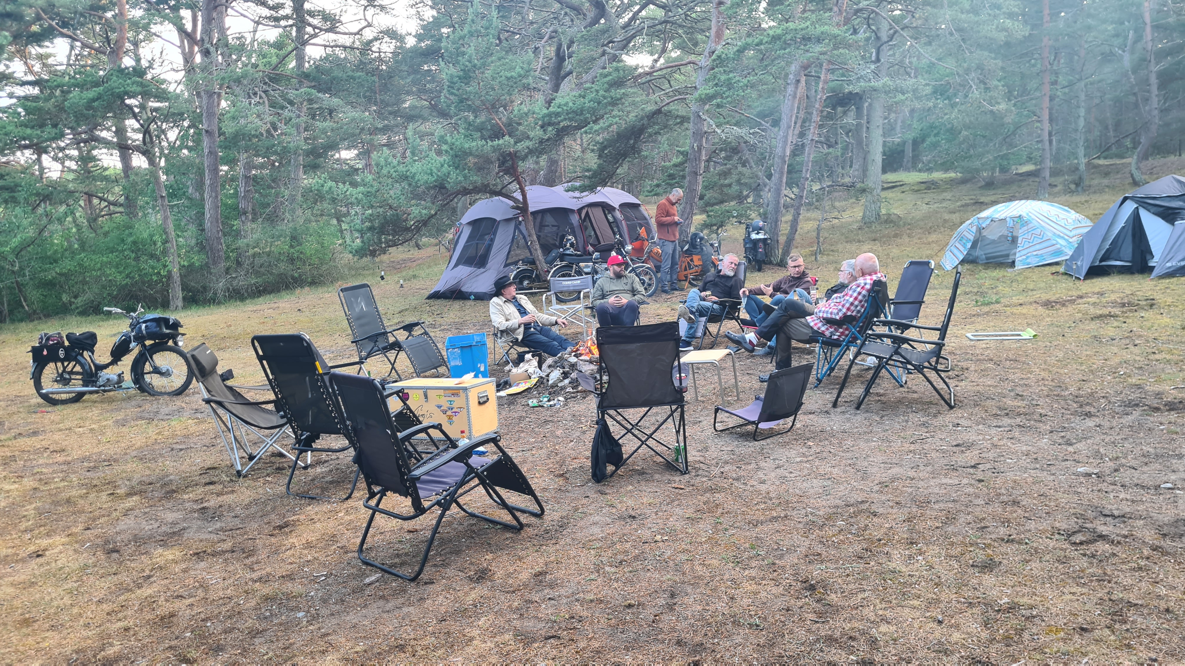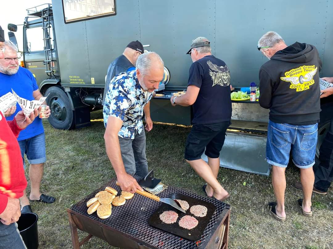 I år regerade Zündapparna och SACHS:arna var fem till antalet och trots majoriteten av Zündapp så var det SACHS:arna som fick vika ner sig med ett par riktigt struliga knotor och ett par med lite småstrul. Dapparna gick dock inte heller helt felfritt, men går i år inte att jämföra mot SACHS:arnas strul, normalt brukar det vara 50-50 med problemen och i år typ 80-20. Bortsett från moppestrul så har GGMT förflutit bra och vädret har varit svalare än medeltalet men ändå rätt nederbördslöst, så när på någon liten uppmuntrande skur. Mycket av åkningen har i år gått utanför asfalten, vilket har varit äventyrligt för gamla gubbryggar, men jäkligt kul. Eftersom vädret bjussat på nederbörd innan vi kom dit så har eldningsrisken varit låg och den obligatoriska kvällsbrasan i vår grilltunna har funkat utan risk att bränna ner ön och när den har funkat så har den obligatoriska grillningarna mättat pojkarnas trinda magar. Naturligtvis så har det kollats på film på vår filmvägg på lastbilssidan, både gamla GGMT-filmer från tidigare år och gamla godingar som Kill Bill, men inget snuskigare. Det har besökts lite livemusik och trevligt folk samt en del butiker att kasta bort pengarna på, så vissa onödiga köp har genomförts och måste förklaras när man kommer hem. I år hade vi en nykomling och en gammal utomstående som är en tilltänkt ny medlem, båda är riktigt goa gubbar som funkar bra i flocken. Tuffar allt på som det ska så landar de flesta på fastlandet om några dagar, några blir kvar på ön som vanligt och de andra fortsätter sommaren med mer rumsrena och familjära uppdrag. För på GGMT så är det grabbsnack, grabbmat, grabbdricka, gubbfylla (man somnar efter 2 bärs alltså), lumparminnen igen och en del mjödlikt dricka, men tyvärr föredrar vissa rosa vin med total avsaknad av manlighet. Om det blir ett GGMT 2024? Nu kan vi ju inget annat och återvänder av gammal vana, eller har det blivit en ovana? Skitsamma, vi har kul, åker en massa moppe och njuter av lägerlivet, doften av sura strumpor och den ständigt smetiga hyn efter all blårök och kvällar vid lägerelden, så det är värt besväret att lägga ner energin på allt förarbete även nästa år och nästnästa år och åren efter det, och troligen tills vi inte får med oss rollatorerna längre och färdtjänsten vägrar att köra oss…..