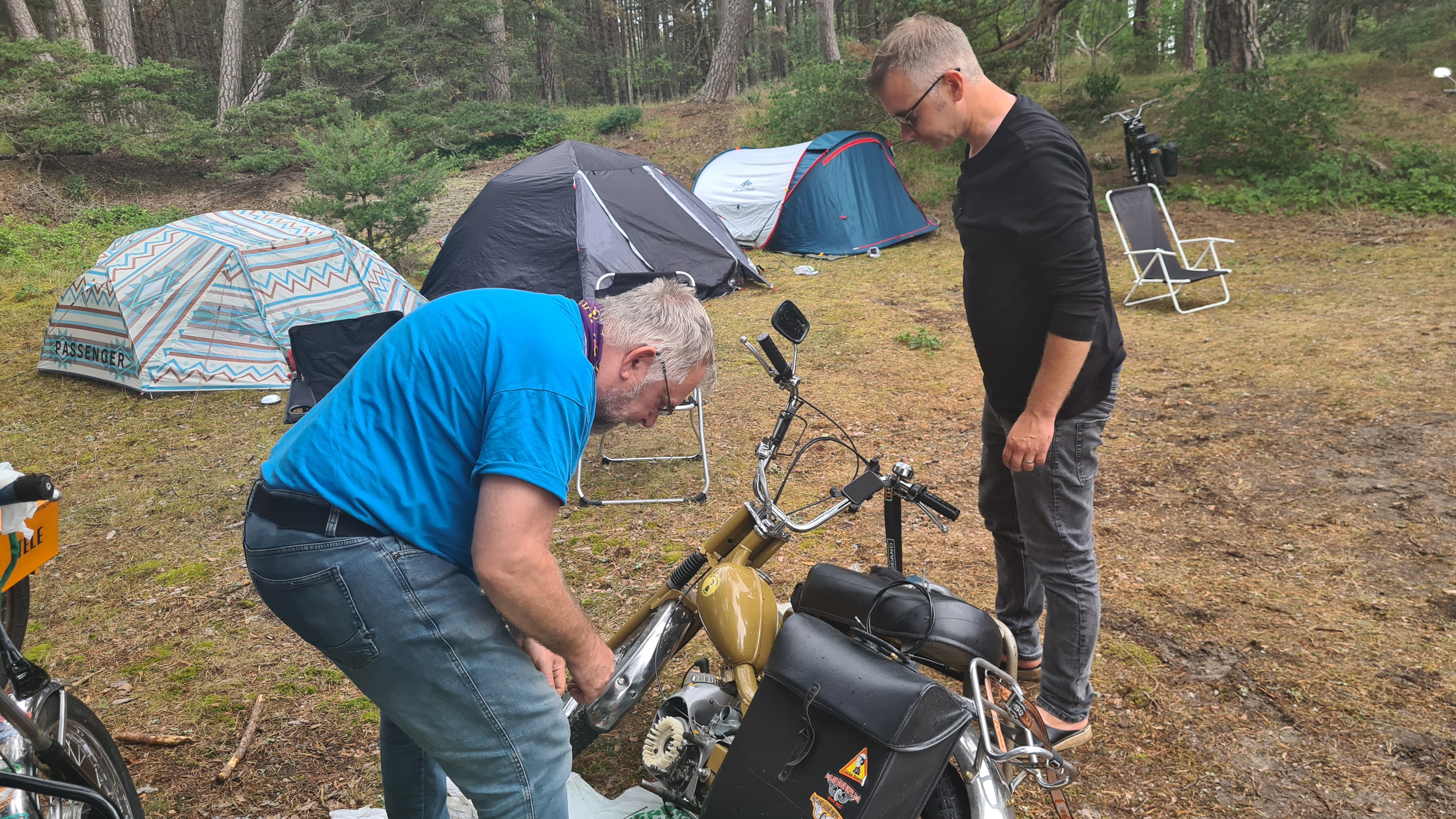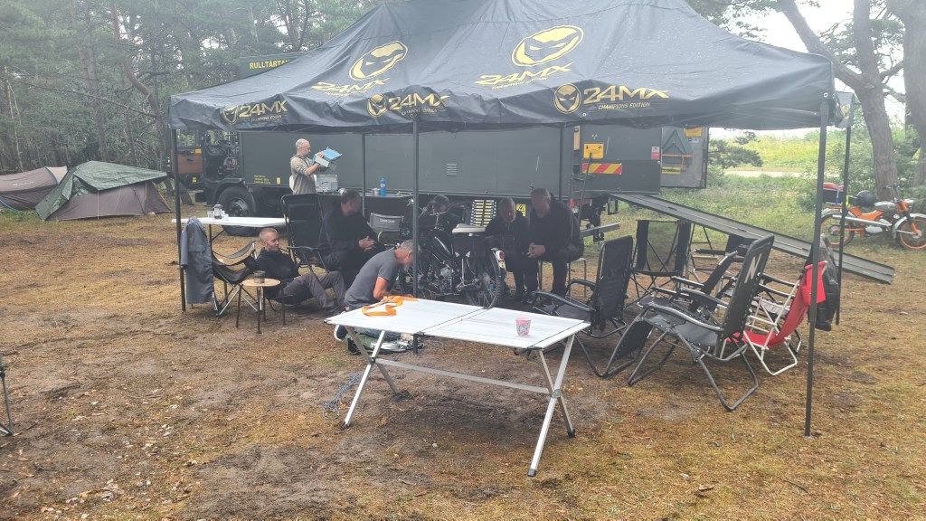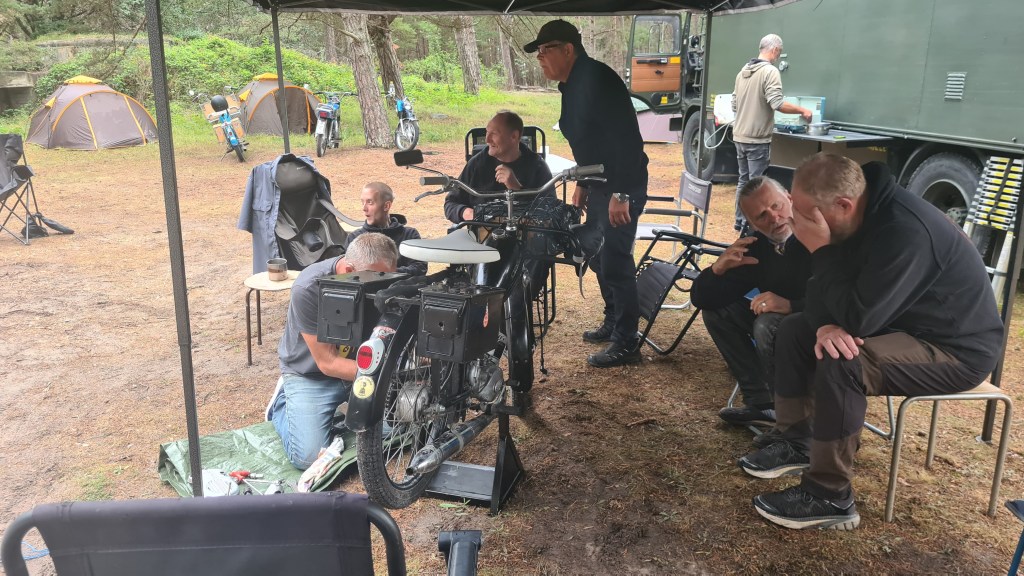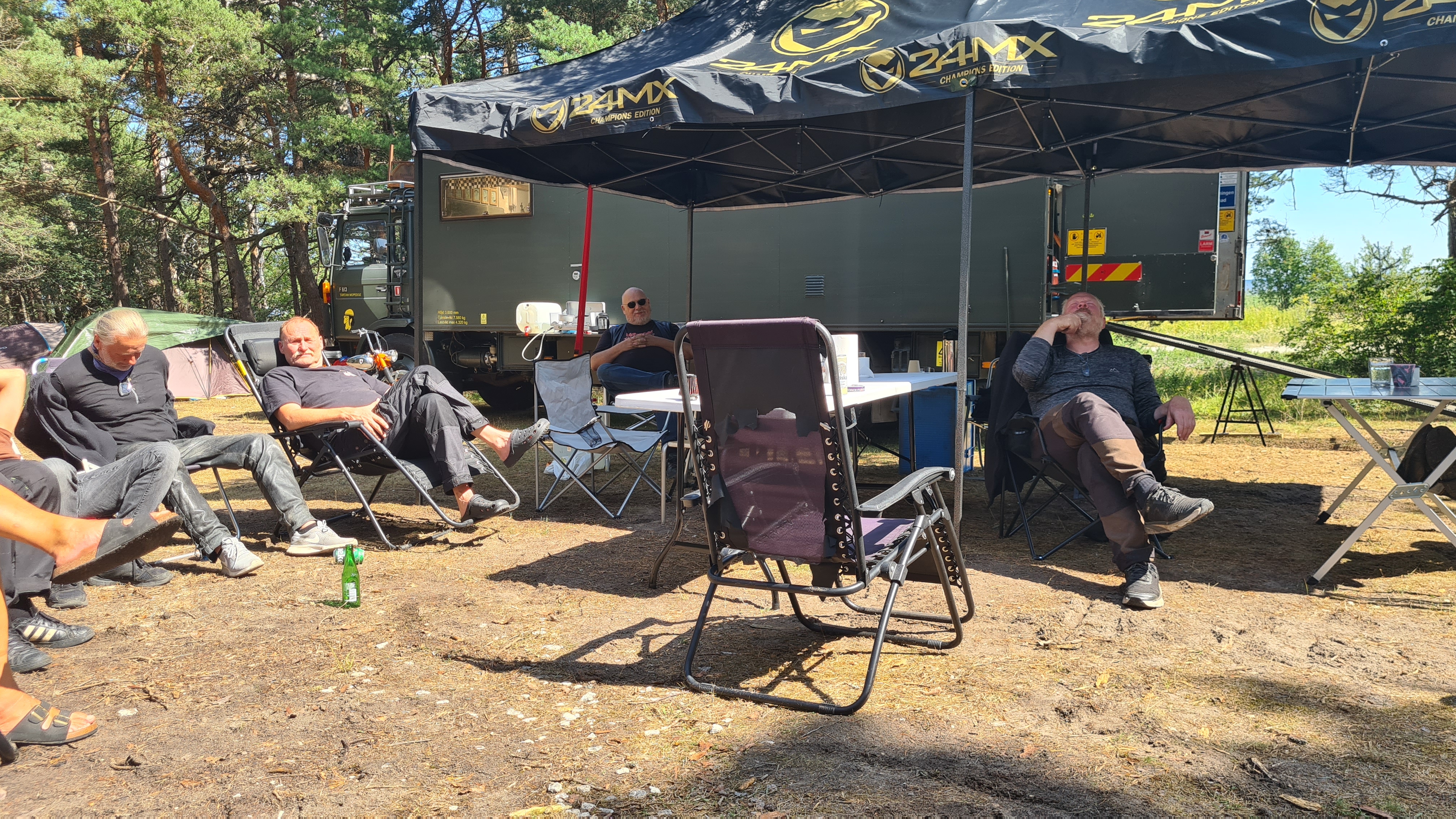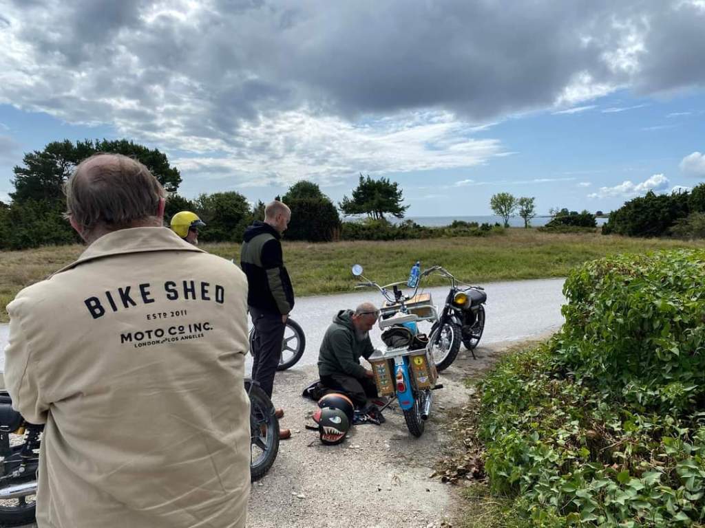 I år regerade Zündapparna och SACHS:arna var fem till antalet och trots majoriteten av Zündapp så var det SACHS:arna som fick vika ner sig med ett par riktigt struliga knotor och ett par med lite småstrul. Dapparna gick dock inte heller helt felfritt, men går i år inte att jämföra mot SACHS:arnas strul, normalt brukar det vara 50-50 med problemen och i år typ 80-20. Bortsett från moppestrul så har GGMT förflutit bra och vädret har varit svalare än medeltalet men ändå rätt nederbördslöst, så när på någon liten uppmuntrande skur. Mycket av åkningen har i år gått utanför asfalten, vilket har varit äventyrligt för gamla gubbryggar, men jäkligt kul. Eftersom vädret bjussat på nederbörd innan vi kom dit så har eldningsrisken varit låg och den obligatoriska kvällsbrasan i vår grilltunna har funkat utan risk att bränna ner ön och när den har funkat så har den obligatoriska grillningarna mättat pojkarnas trinda magar. Naturligtvis så har det kollats på film på vår filmvägg på lastbilssidan, både gamla GGMT-filmer från tidigare år och gamla godingar som Kill Bill, men inget snuskigare. Det har besökts lite livemusik och trevligt folk samt en del butiker att kasta bort pengarna på, så vissa onödiga köp har genomförts och måste förklaras när man kommer hem. I år hade vi en nykomling och en gammal utomstående som är en tilltänkt ny medlem, båda är riktigt goa gubbar som funkar bra i flocken. Tuffar allt på som det ska så landar de flesta på fastlandet om några dagar, några blir kvar på ön som vanligt och de andra fortsätter sommaren med mer rumsrena och familjära uppdrag. För på GGMT så är det grabbsnack, grabbmat, grabbdricka, gubbfylla (man somnar efter 2 bärs alltså), lumparminnen igen och en del mjödlikt dricka, men tyvärr föredrar vissa rosa vin med total avsaknad av manlighet. Om det blir ett GGMT 2024? Nu kan vi ju inget annat och återvänder av gammal vana, eller har det blivit en ovana? Skitsamma, vi har kul, åker en massa moppe och njuter av lägerlivet, doften av sura strumpor och den ständigt smetiga hyn efter all blårök och kvällar vid lägerelden, så det är värt besväret att lägga ner energin på allt förarbete även nästa år och nästnästa år och åren efter det, och troligen tills vi inte får med oss rollatorerna längre och färdtjänsten vägrar att köra oss…..