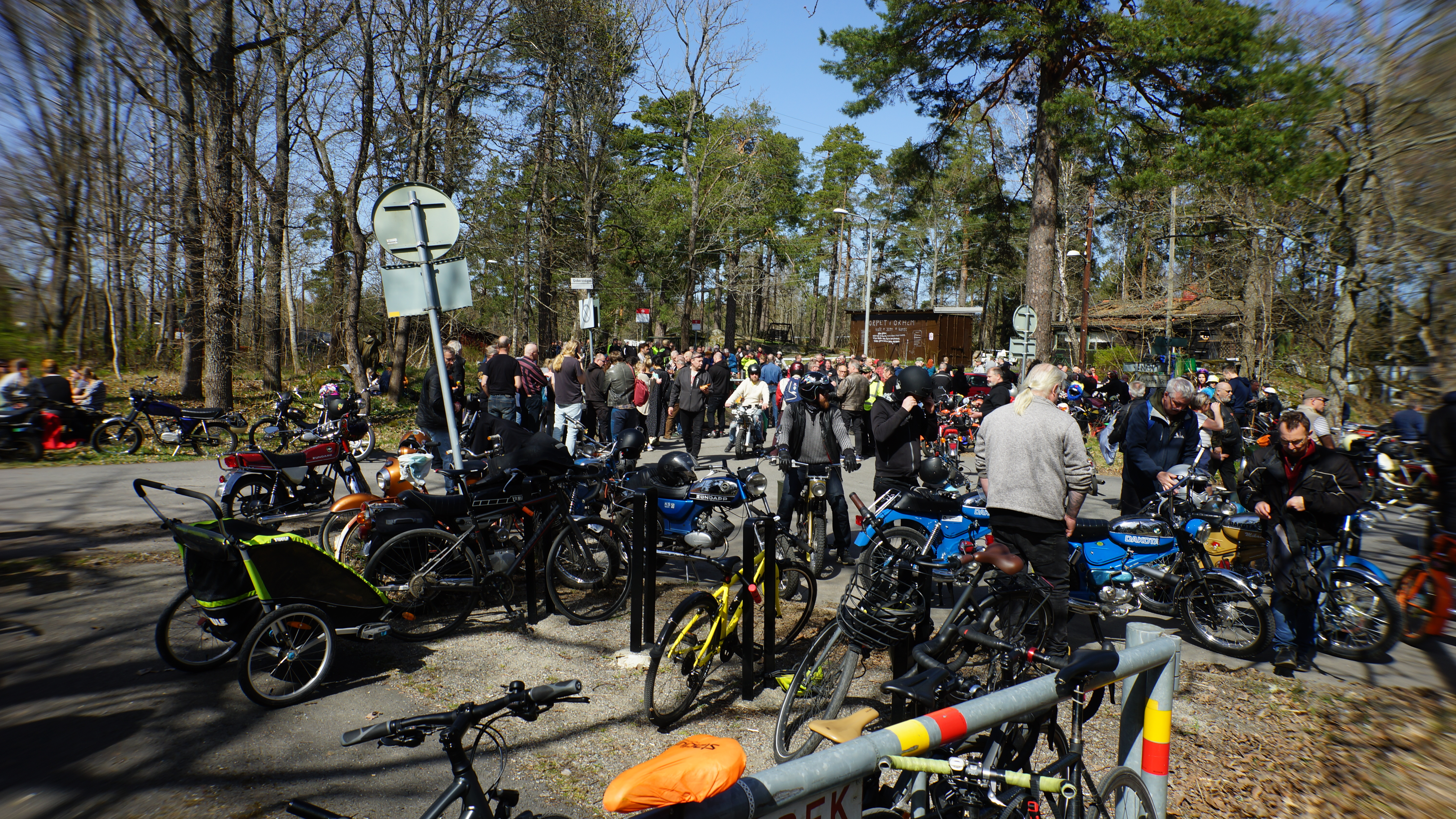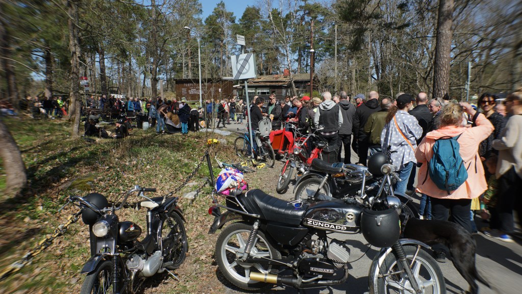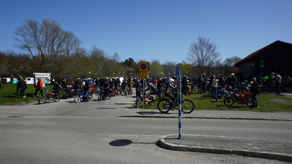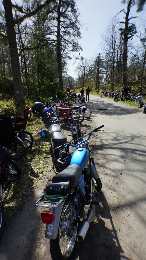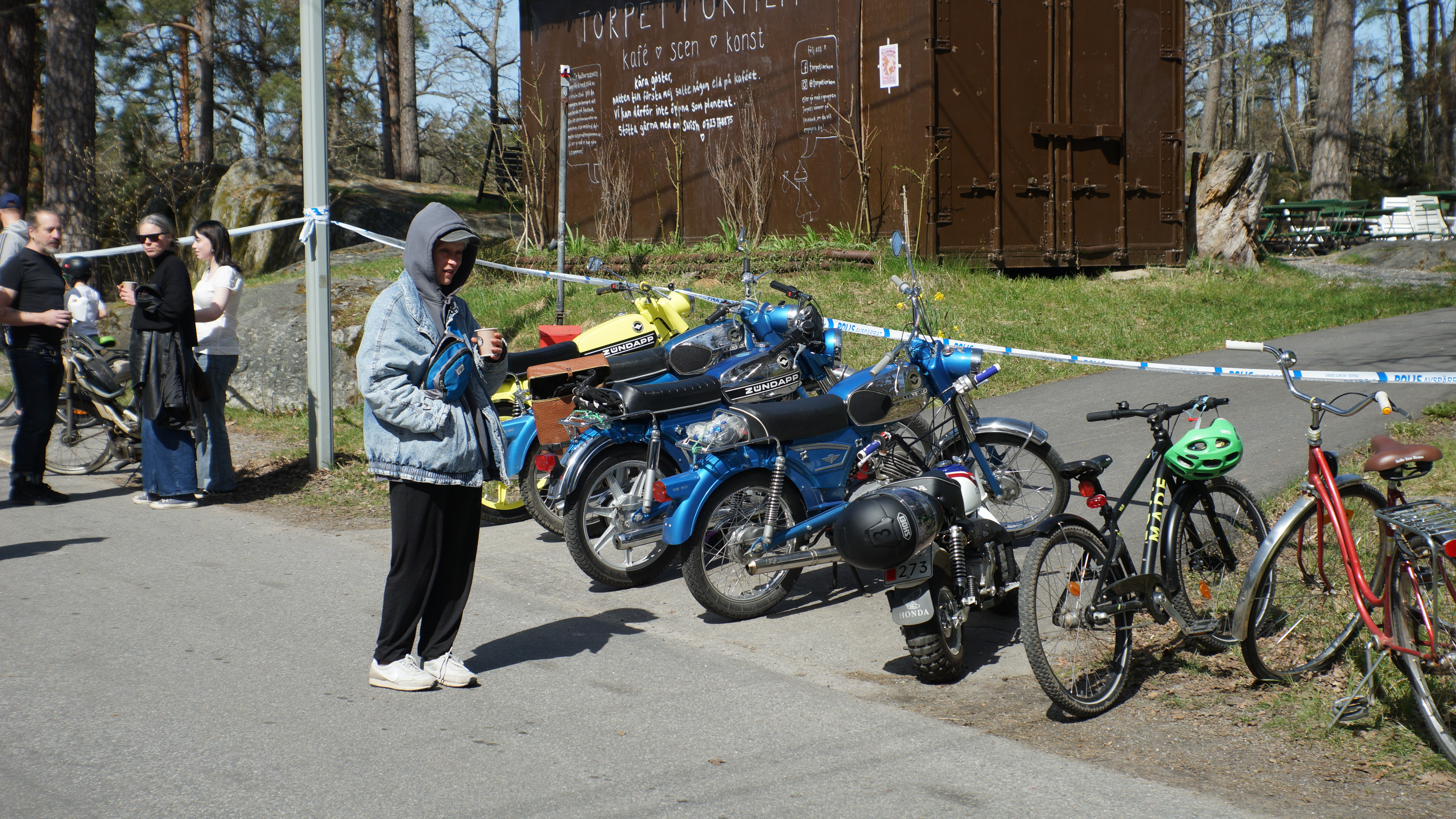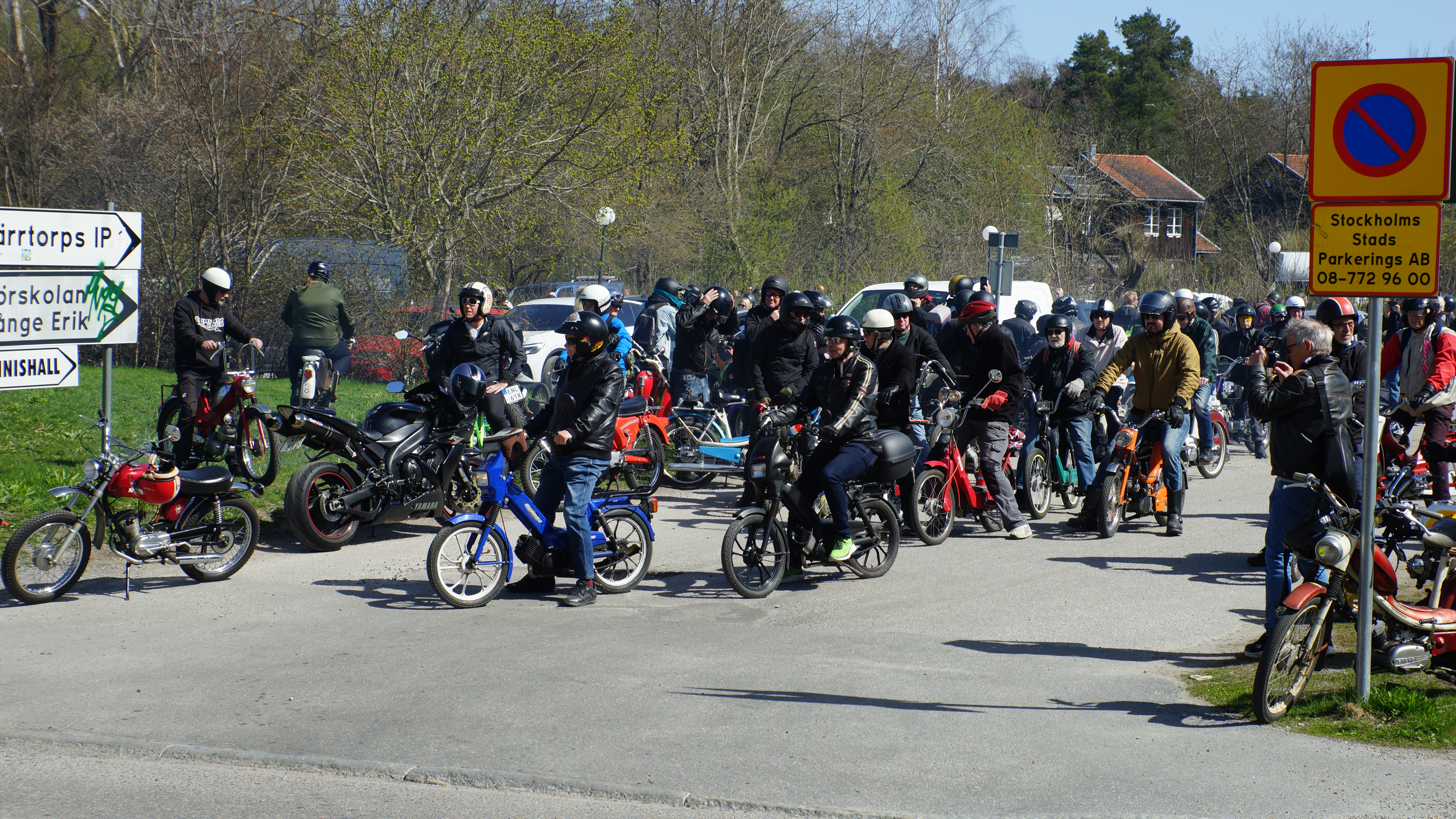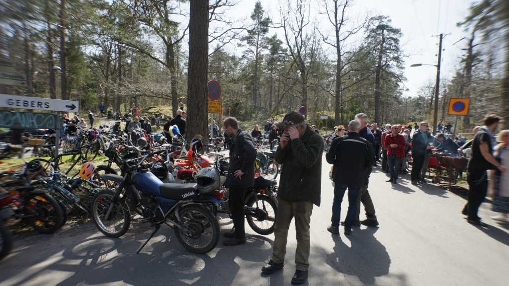 Det som gav smolk i bägaren den här dagen som bjöd på både värme och sol, var att under natten så hade någon galen gök tänt eld på målet för resan; Café Torpet i Orhem. Det är tradition sedan väldigt många år att vi ringer in beställning på mackor vid starten där alla får boka mackor som sedan är klara när vi kommer fram till Orhem, det är så det ska vara. Men efter den anlagda branden på natten så kom det här av sig, men skam den som ger sig; personalen på Café Torpet fixade ändå mackor, kaffe och korv i skogsdungen rakt över vägen från det avspärrade Café Torpet! Med hjälp av frivilliga så lyckades man att mätta oss mopedister när vi väl anlände dit, en riktig hjälteinsats för att hålla traditionen levande! Det här tackar vi varmt för och vi kommer även nästa år att göra om det här, fast då i förhoppningsvis ny uppbyggda lokaliteter. Att byta mål för årets Vårrunda var inget alternativ, det är från Kärrtorps IP till Café Torpet i Orhem som gäller. Dagen var trots allt väldigt munter i blåröken och i år så gick rundan den gamla vanliga vägen över Hammarbyhöjden, Hammarby Sjöstad, Sickla, Hellasgården (med ett kort stopp), Älta, Flaten och till Orhem. Ett tack till alla som kom och körde, de som arrande och speciellt till Café Torpet som gjorde dagen komplett. Nedan ett gäng bilder tagna under dagen på alla härliga ekipage 😉