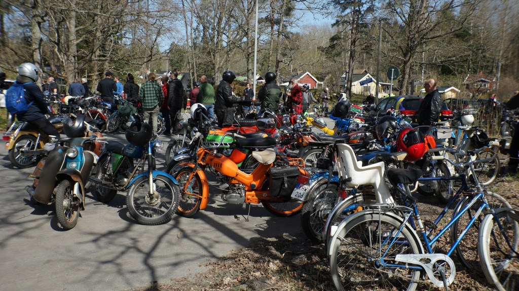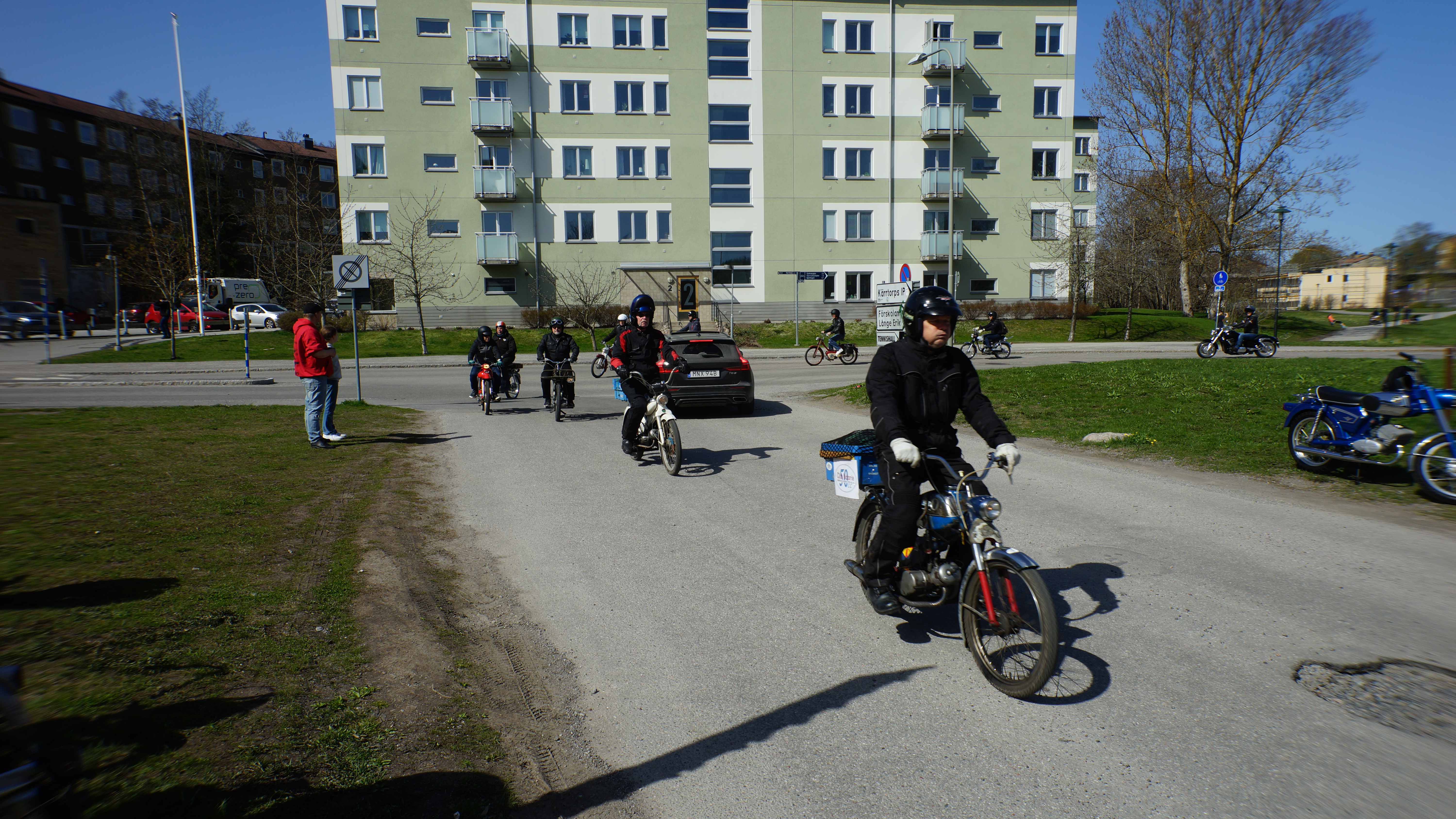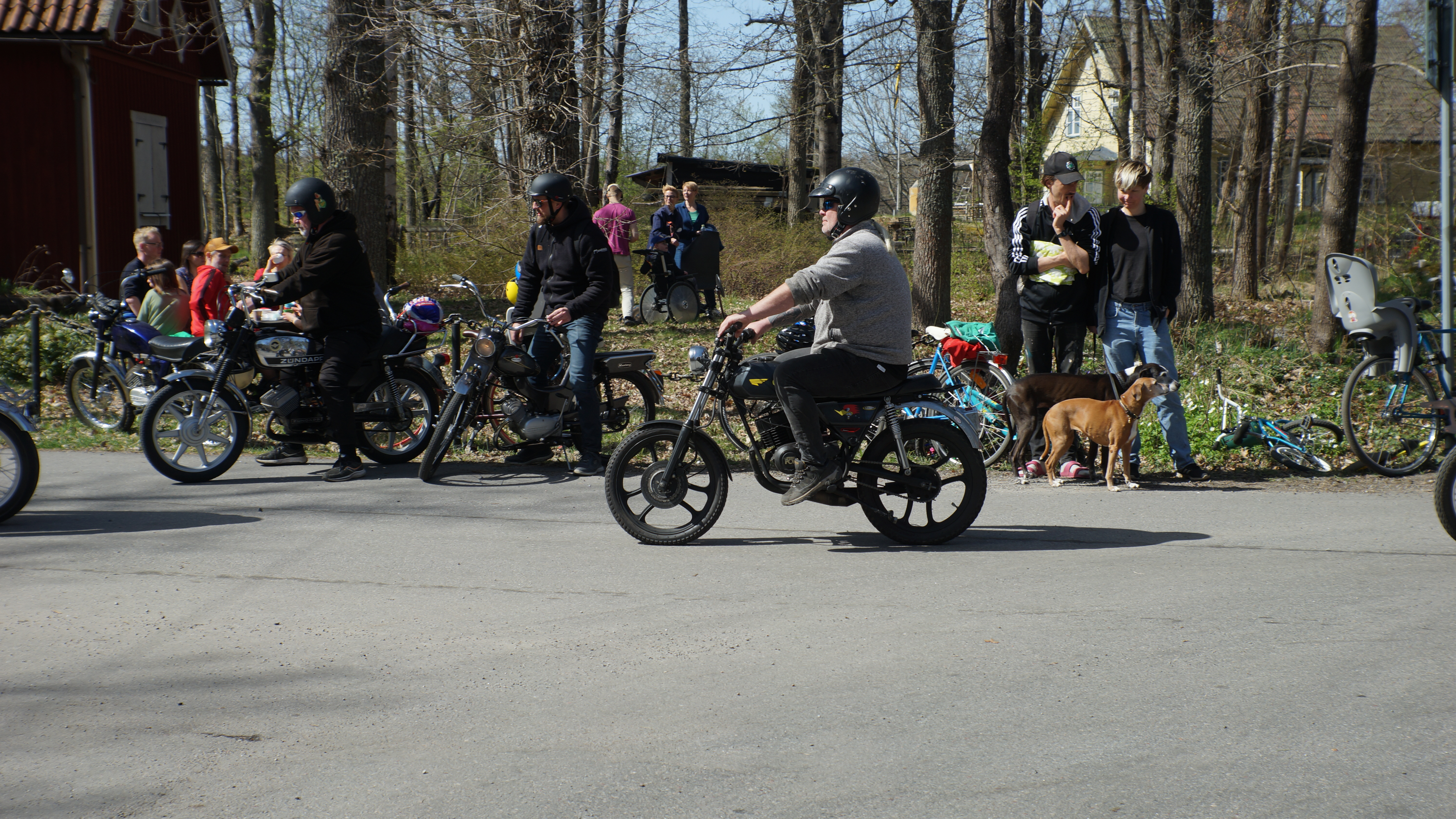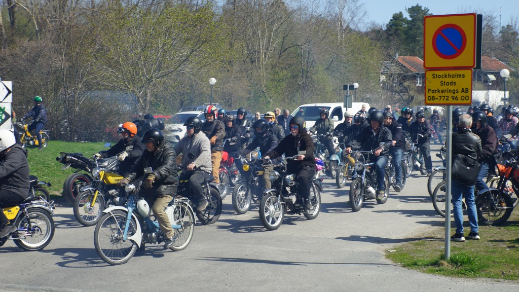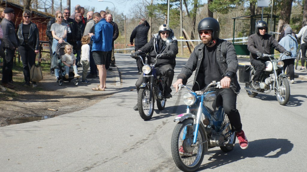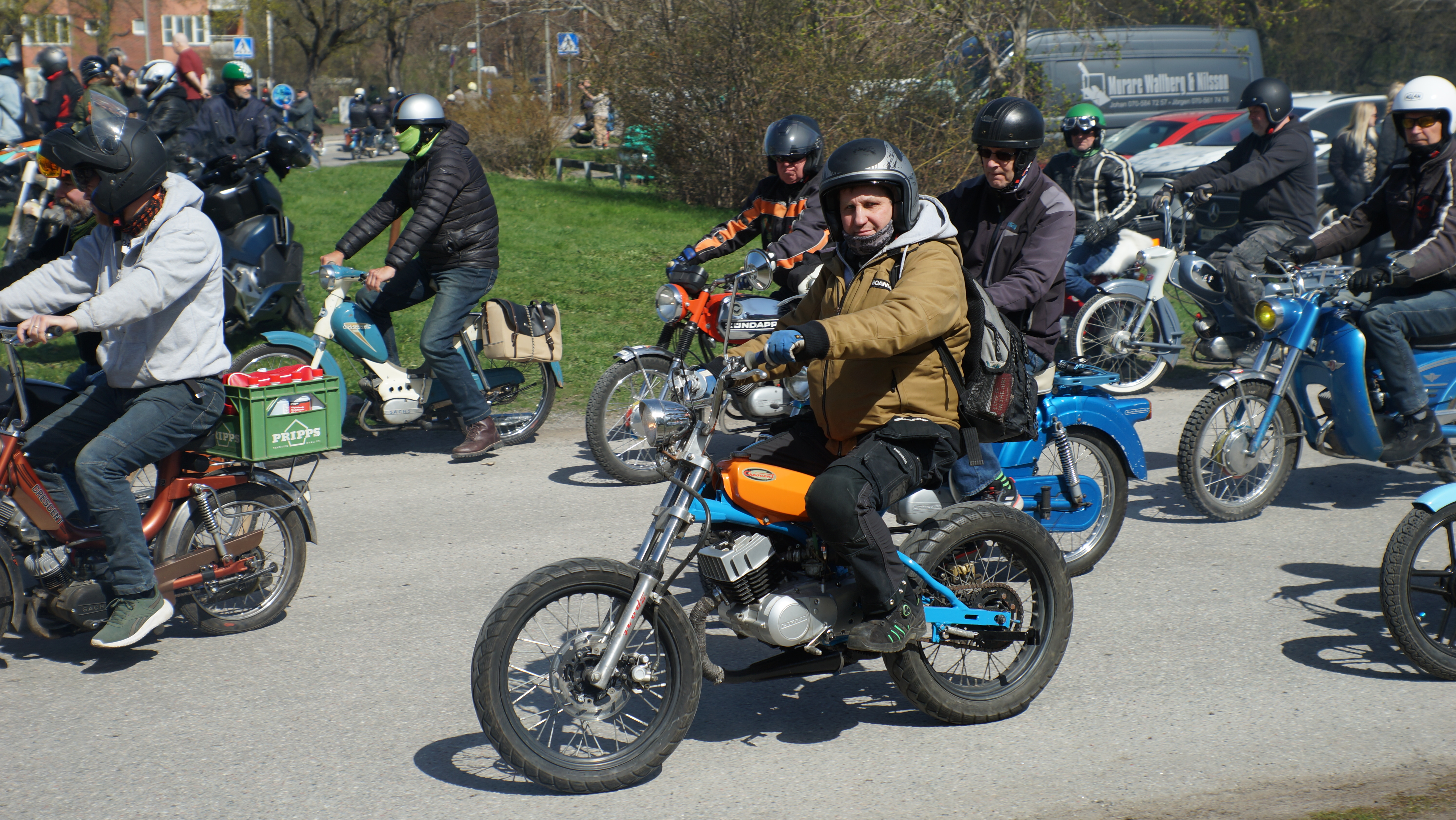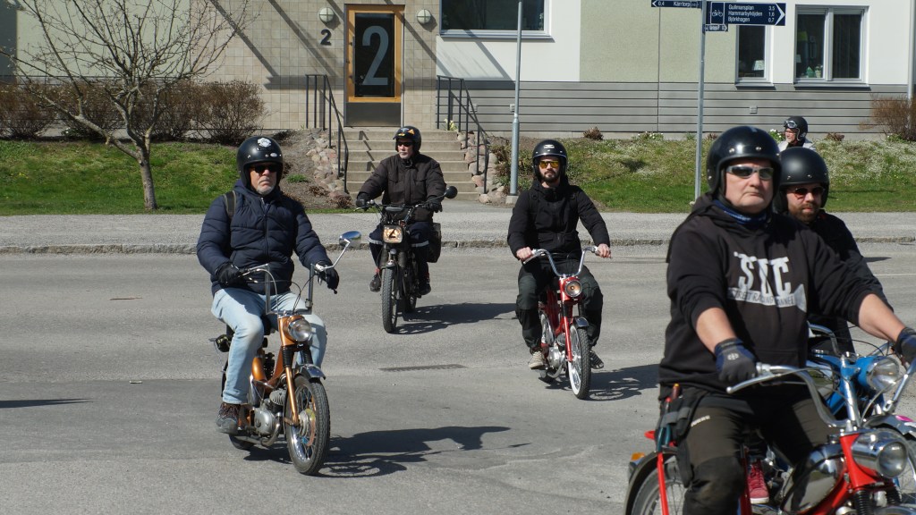 Det som gav smolk i bägaren den här dagen som bjöd på både värme och sol, var att under natten så hade någon galen gök tänt eld på målet för resan; Café Torpet i Orhem. Det är tradition sedan väldigt många år att vi ringer in beställning på mackor vid starten där alla får boka mackor som sedan är klara när vi kommer fram till Orhem, det är så det ska vara. Men efter den anlagda branden på natten så kom det här av sig, men skam den som ger sig; personalen på Café Torpet fixade ändå mackor, kaffe och korv i skogsdungen rakt över vägen från det avspärrade Café Torpet! Med hjälp av frivilliga så lyckades man att mätta oss mopedister när vi väl anlände dit, en riktig hjälteinsats för att hålla traditionen levande! Det här tackar vi varmt för och vi kommer även nästa år att göra om det här, fast då i förhoppningsvis ny uppbyggda lokaliteter. Att byta mål för årets Vårrunda var inget alternativ, det är från Kärrtorps IP till Café Torpet i Orhem som gäller. Dagen var trots allt väldigt munter i blåröken och i år så gick rundan den gamla vanliga vägen över Hammarbyhöjden, Hammarby Sjöstad, Sickla, Hellasgården (med ett kort stopp), Älta, Flaten och till Orhem. Ett tack till alla som kom och körde, de som arrande och speciellt till Café Torpet som gjorde dagen komplett. Nedan ett gäng bilder tagna under dagen på alla härliga ekipage 😉