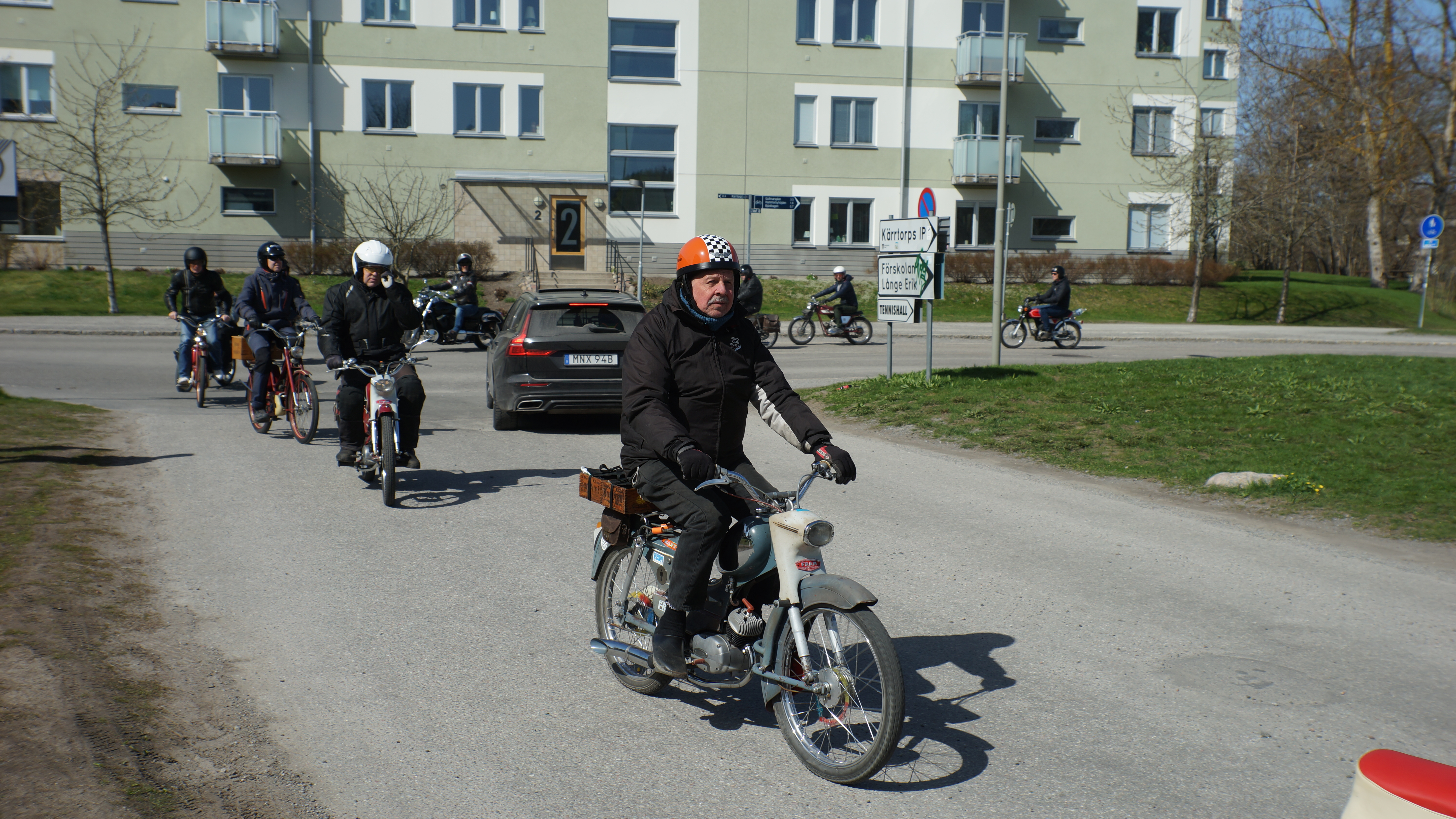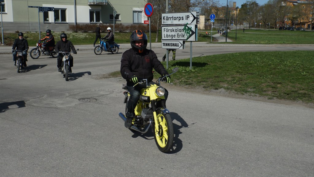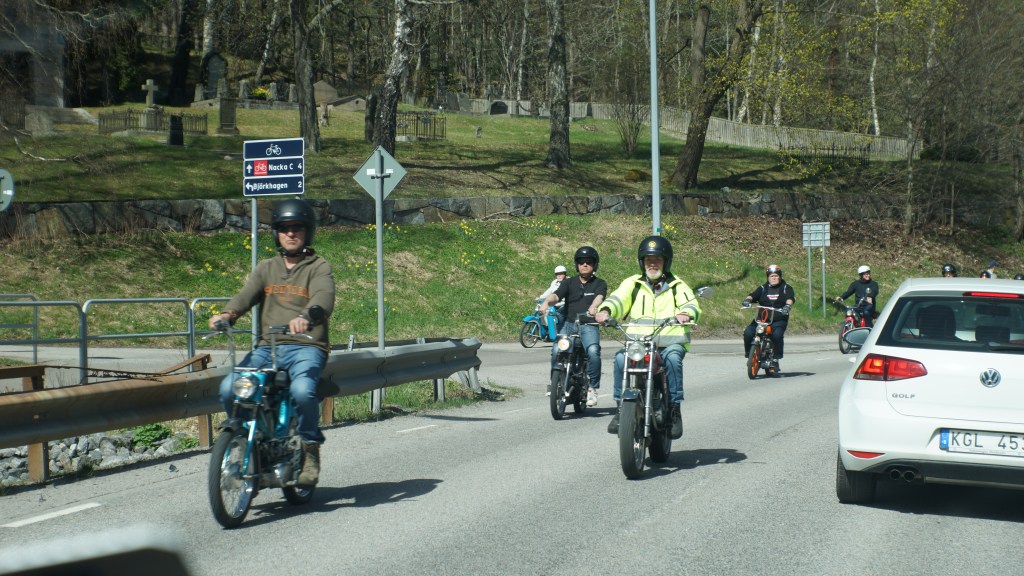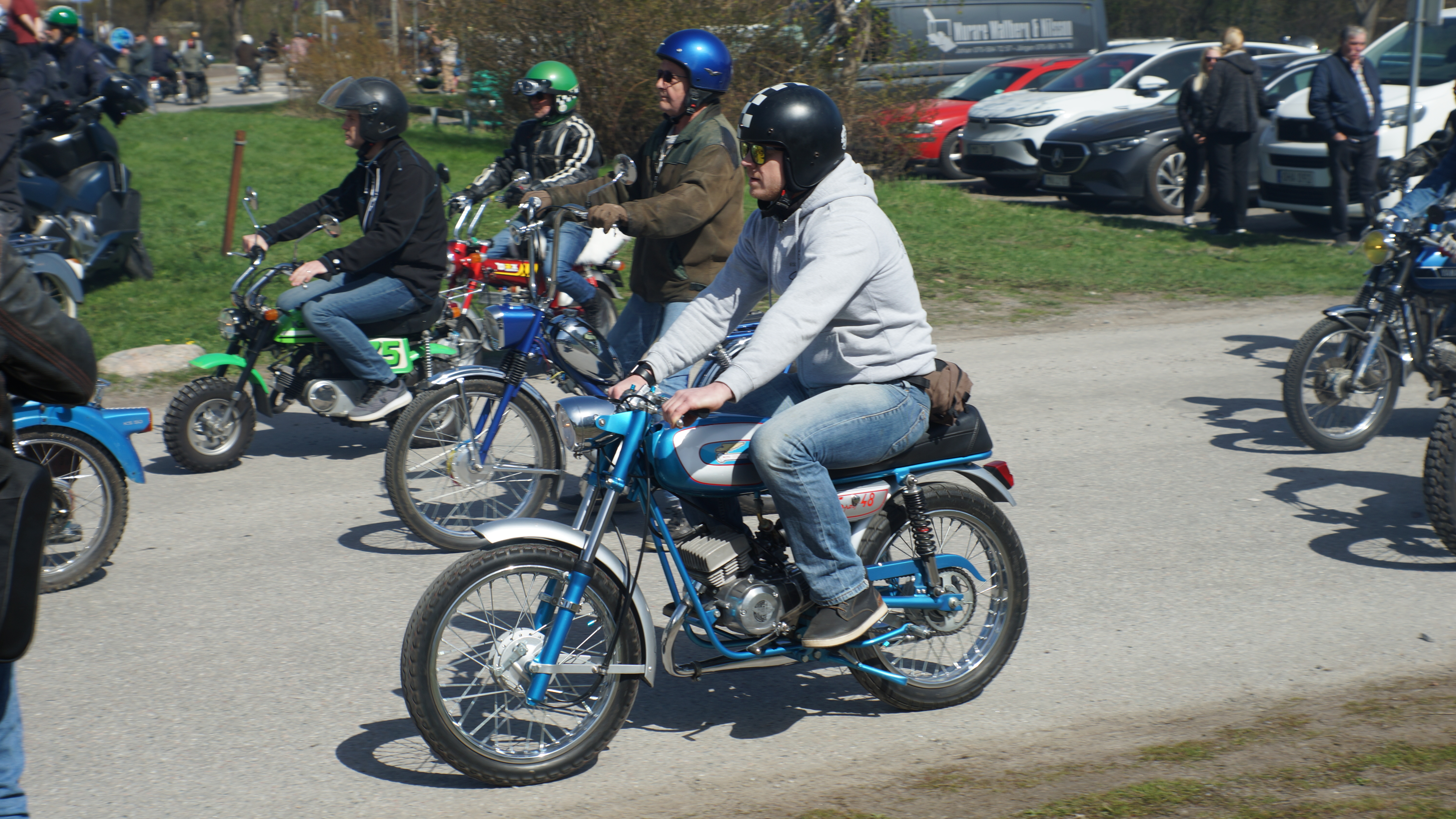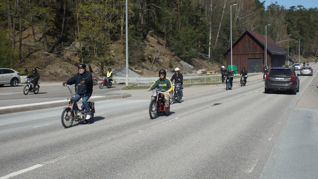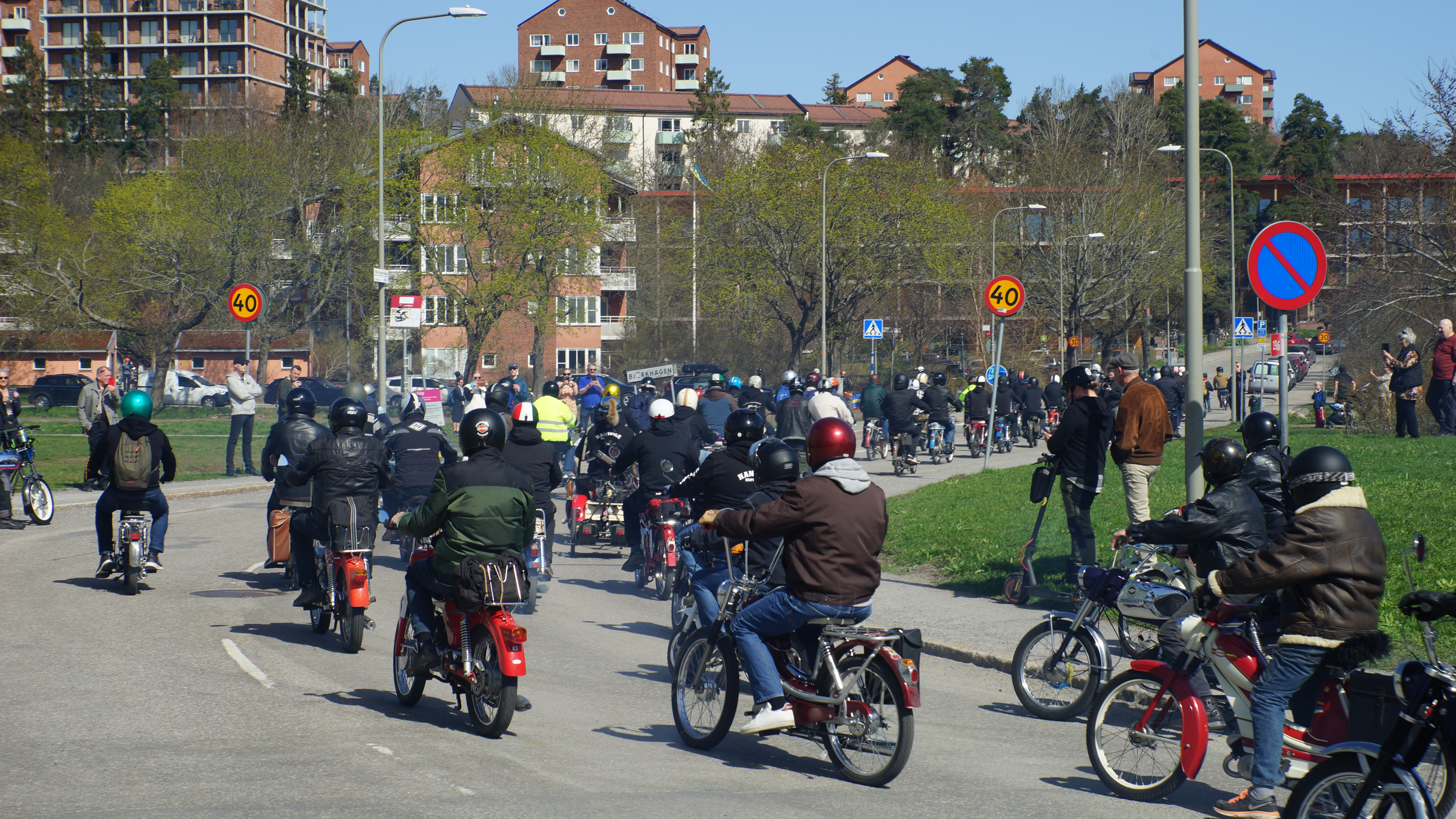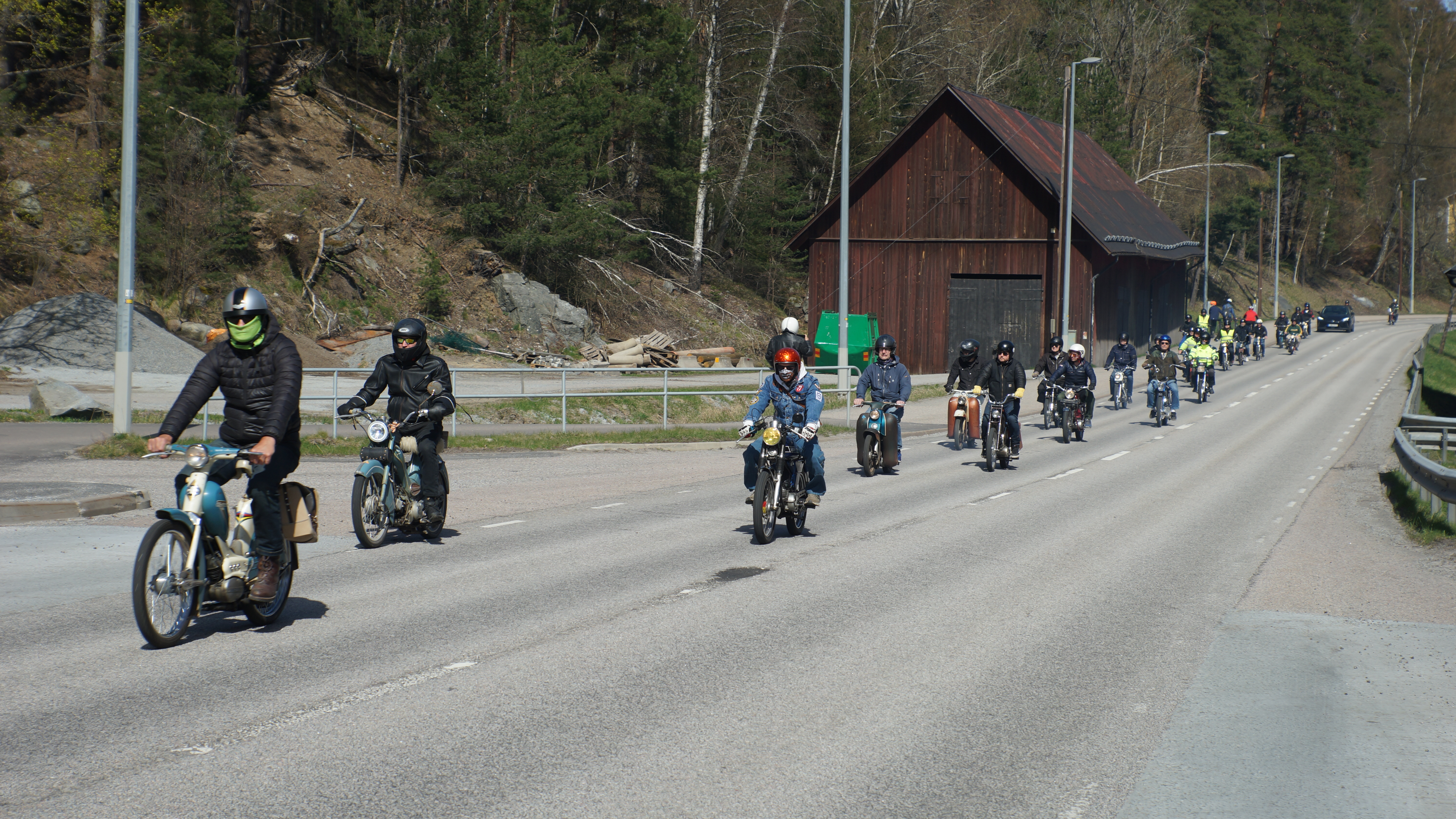 Det som gav smolk i bägaren den här dagen som bjöd på både värme och sol, var att under natten så hade någon galen gök tänt eld på målet för resan; Café Torpet i Orhem. Det är tradition sedan väldigt många år att vi ringer in beställning på mackor vid starten där alla får boka mackor som sedan är klara när vi kommer fram till Orhem, det är så det ska vara. Men efter den anlagda branden på natten så kom det här av sig, men skam den som ger sig; personalen på Café Torpet fixade ändå mackor, kaffe och korv i skogsdungen rakt över vägen från det avspärrade Café Torpet! Med hjälp av frivilliga så lyckades man att mätta oss mopedister när vi väl anlände dit, en riktig hjälteinsats för att hålla traditionen levande! Det här tackar vi varmt för och vi kommer även nästa år att göra om det här, fast då i förhoppningsvis ny uppbyggda lokaliteter. Att byta mål för årets Vårrunda var inget alternativ, det är från Kärrtorps IP till Café Torpet i Orhem som gäller. Dagen var trots allt väldigt munter i blåröken och i år så gick rundan den gamla vanliga vägen över Hammarbyhöjden, Hammarby Sjöstad, Sickla, Hellasgården (med ett kort stopp), Älta, Flaten och till Orhem. Ett tack till alla som kom och körde, de som arrande och speciellt till Café Torpet som gjorde dagen komplett. Nedan ett gäng bilder tagna under dagen på alla härliga ekipage 😉