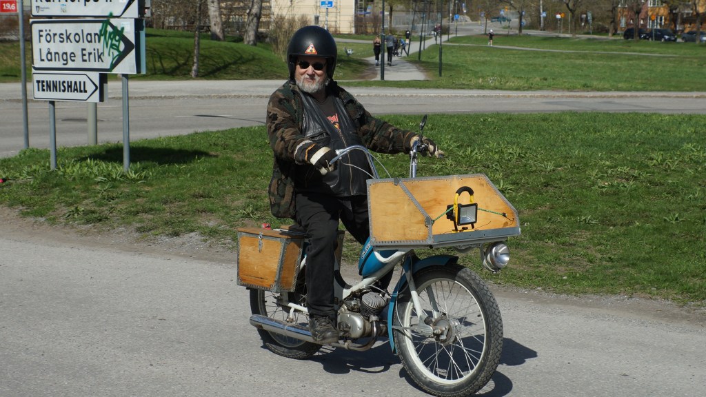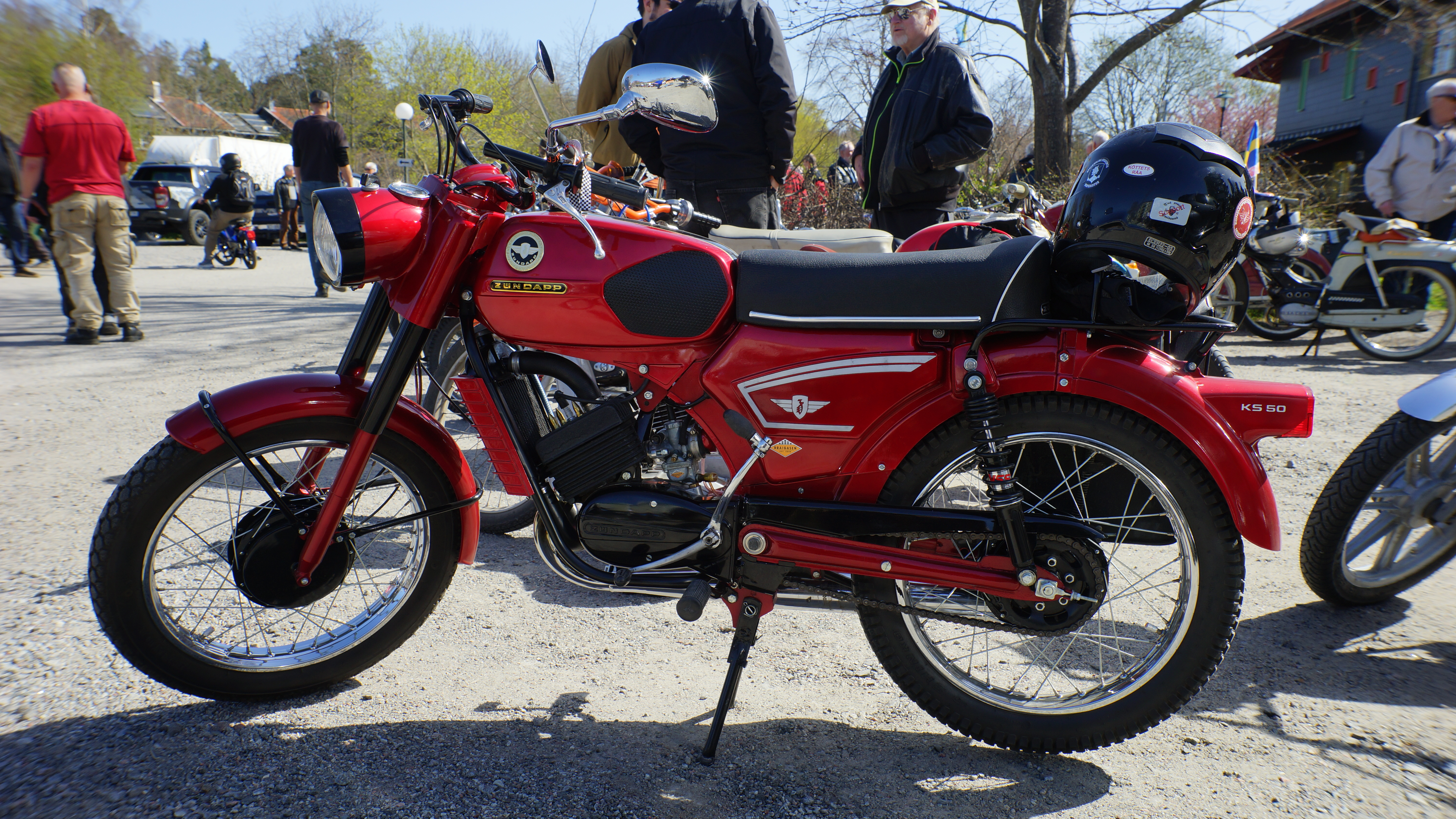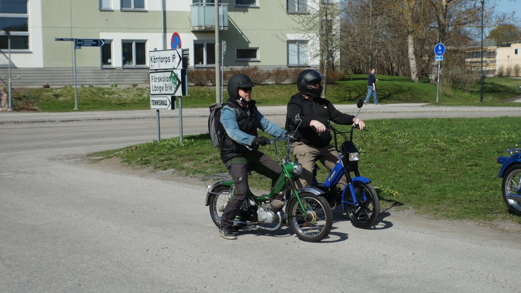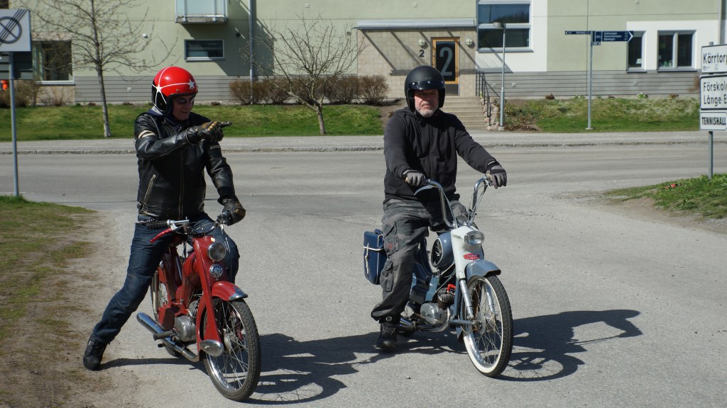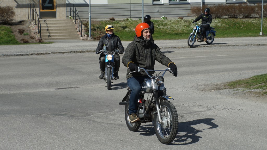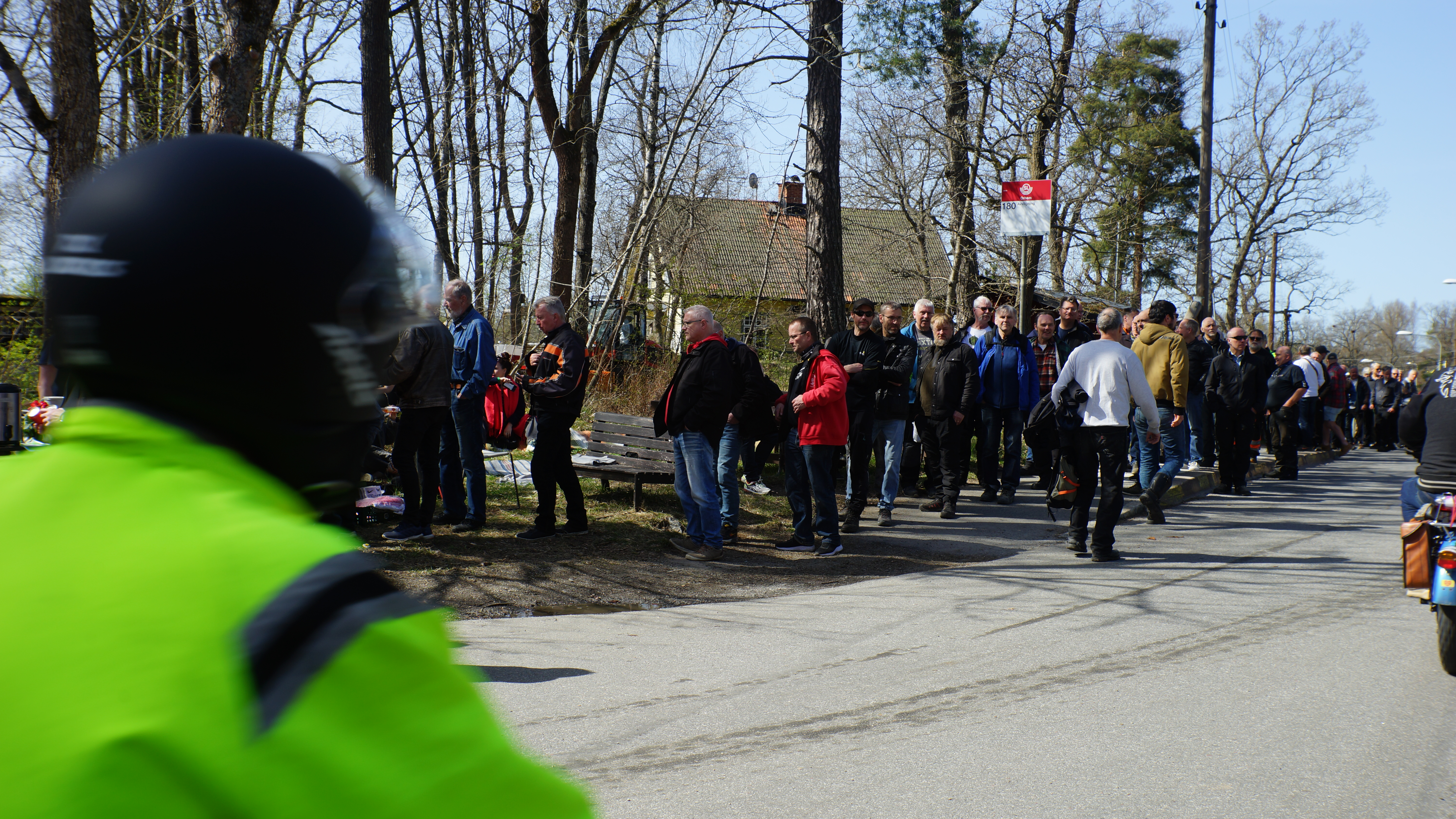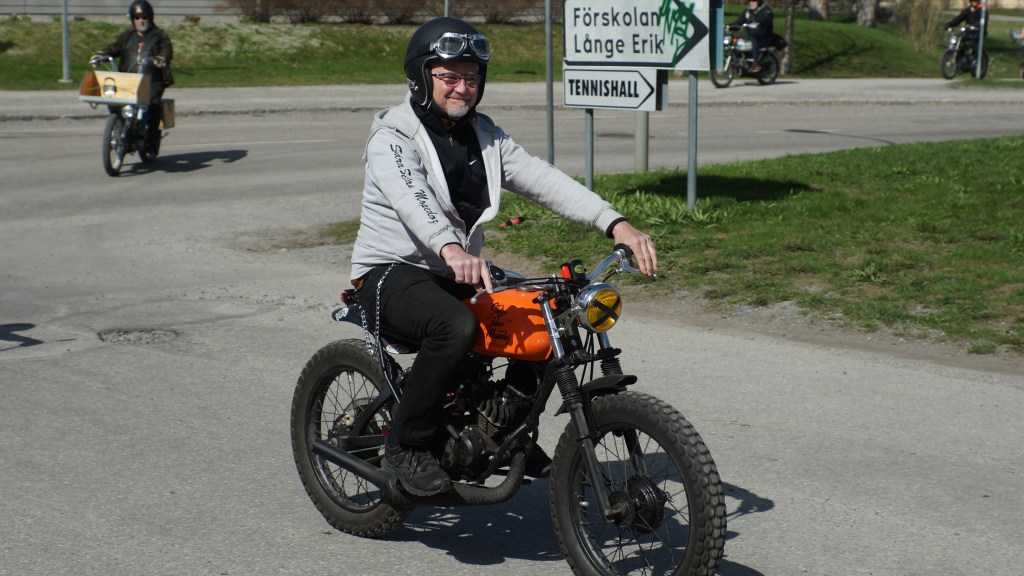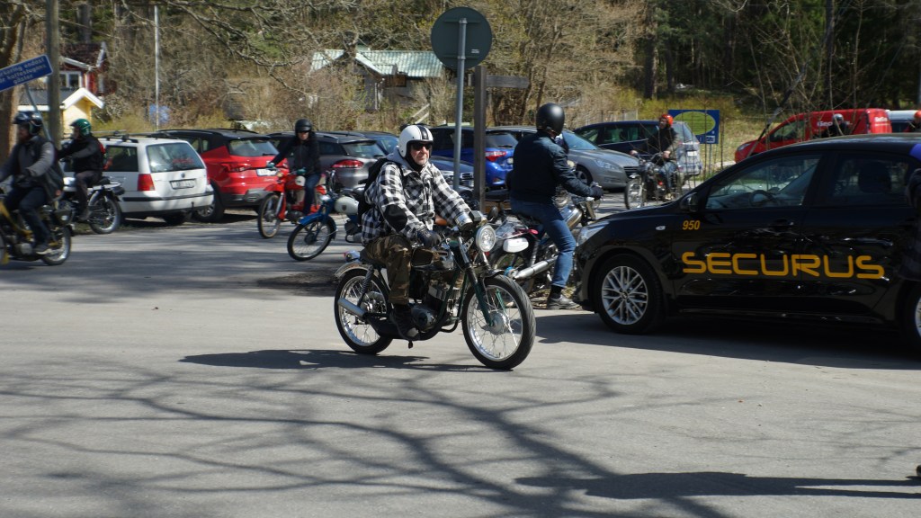 Det som gav smolk i bägaren den här dagen som bjöd på både värme och sol, var att under natten så hade någon galen gök tänt eld på målet för resan; Café Torpet i Orhem. Det är tradition sedan väldigt många år att vi ringer in beställning på mackor vid starten där alla får boka mackor som sedan är klara när vi kommer fram till Orhem, det är så det ska vara. Men efter den anlagda branden på natten så kom det här av sig, men skam den som ger sig; personalen på Café Torpet fixade ändå mackor, kaffe och korv i skogsdungen rakt över vägen från det avspärrade Café Torpet! Med hjälp av frivilliga så lyckades man att mätta oss mopedister när vi väl anlände dit, en riktig hjälteinsats för att hålla traditionen levande! Det här tackar vi varmt för och vi kommer även nästa år att göra om det här, fast då i förhoppningsvis ny uppbyggda lokaliteter. Att byta mål för årets Vårrunda var inget alternativ, det är från Kärrtorps IP till Café Torpet i Orhem som gäller. Dagen var trots allt väldigt munter i blåröken och i år så gick rundan den gamla vanliga vägen över Hammarbyhöjden, Hammarby Sjöstad, Sickla, Hellasgården (med ett kort stopp), Älta, Flaten och till Orhem. Ett tack till alla som kom och körde, de som arrande och speciellt till Café Torpet som gjorde dagen komplett. Nedan ett gäng bilder tagna under dagen på alla härliga ekipage 😉