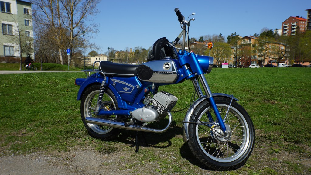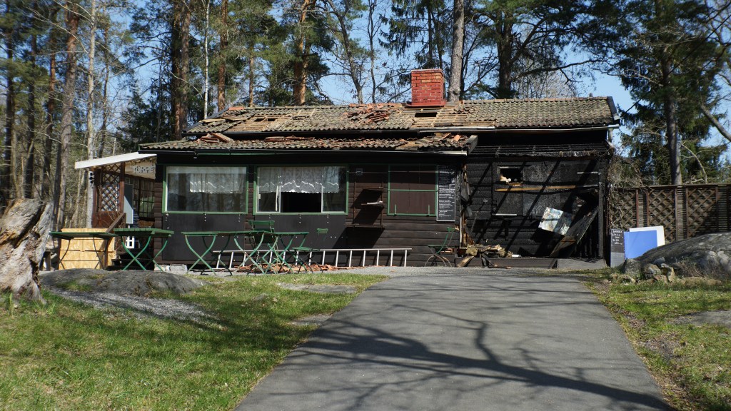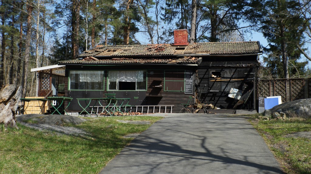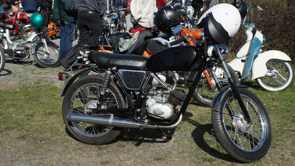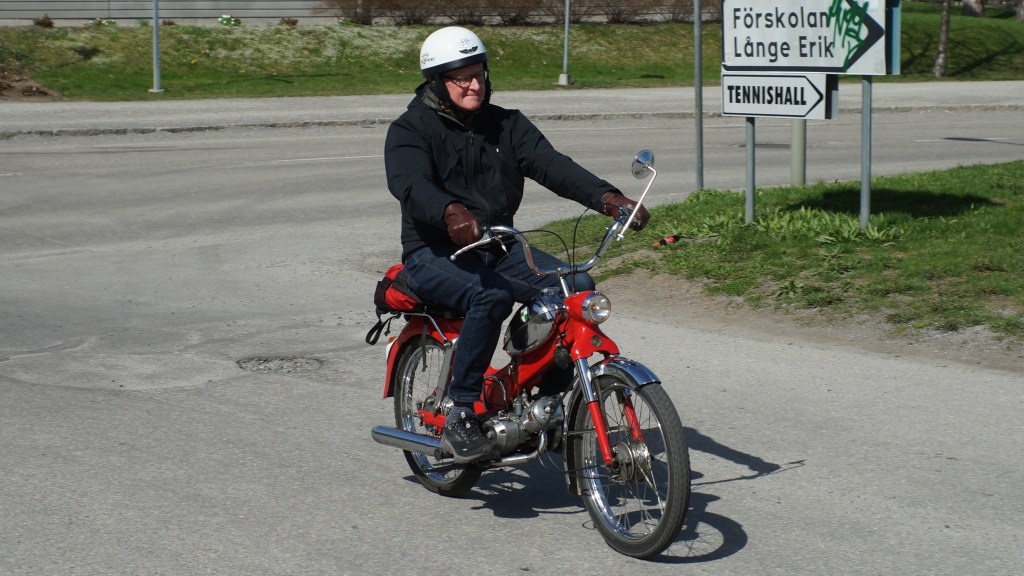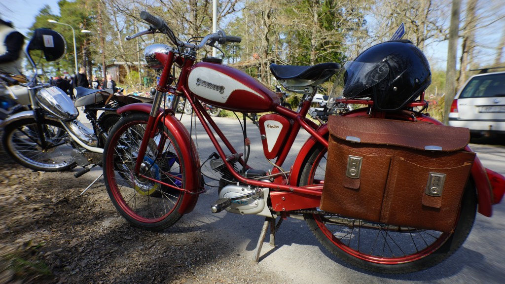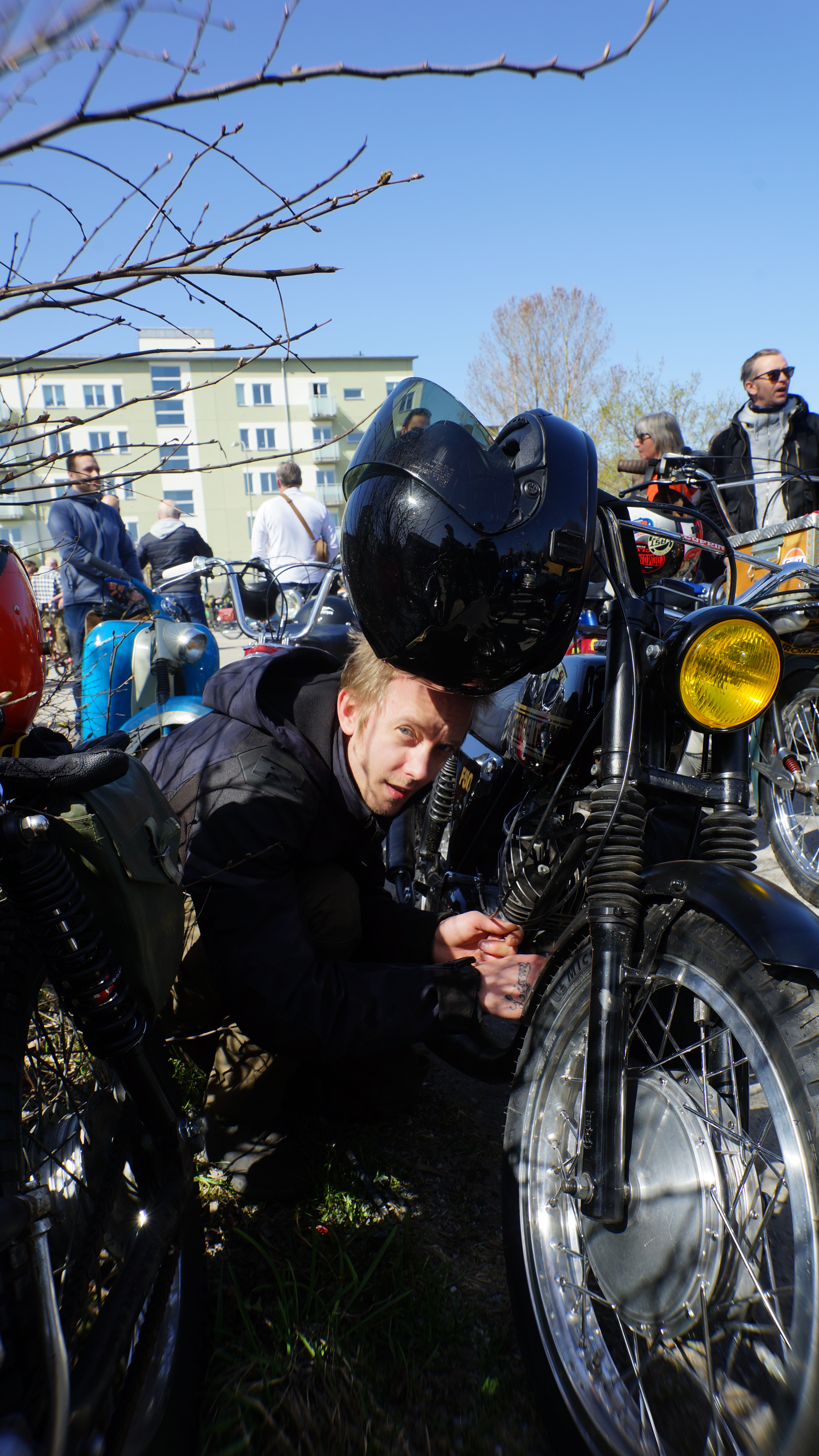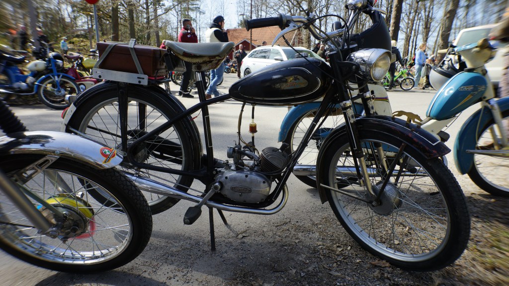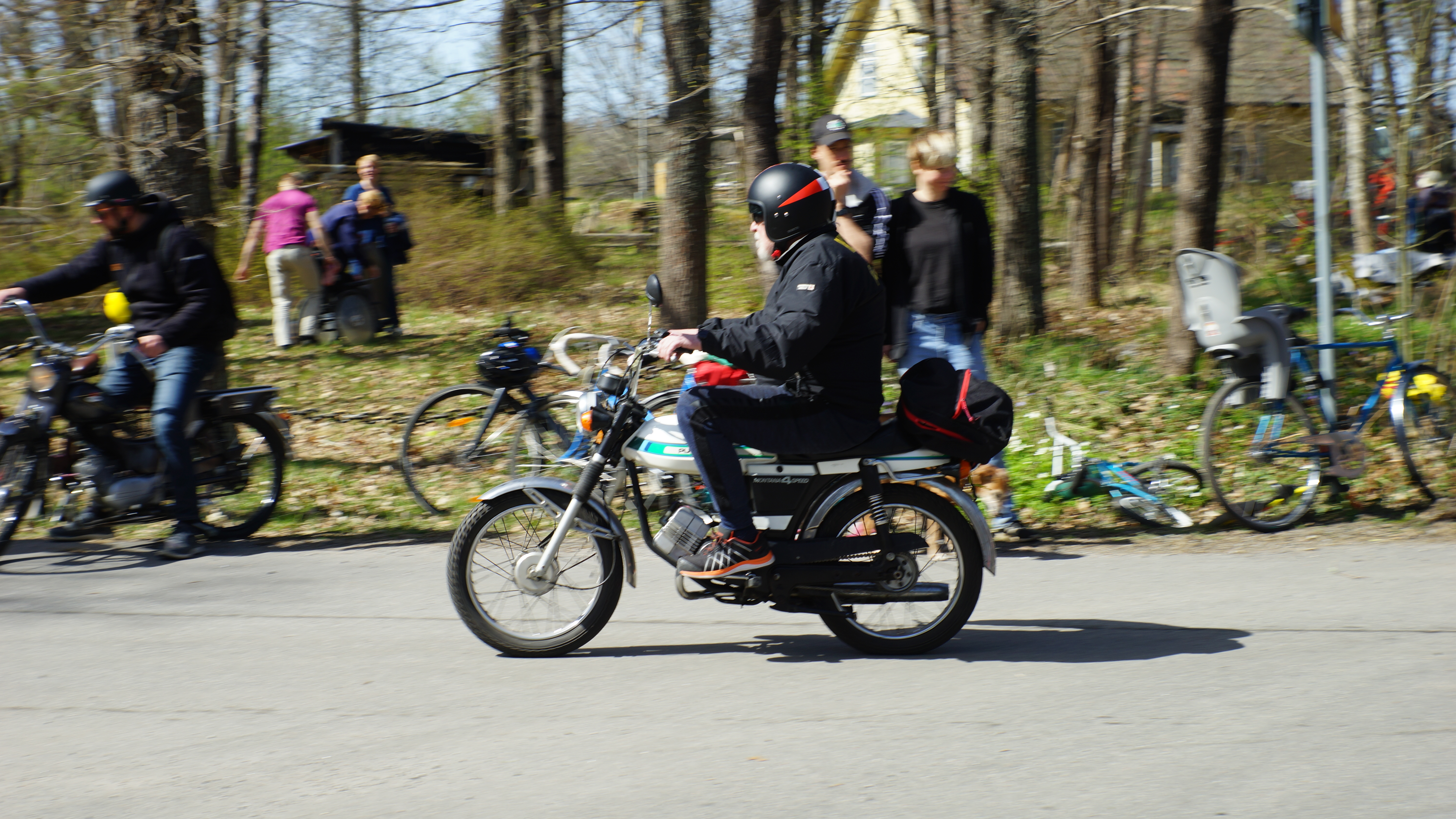 Det som gav smolk i bägaren den här dagen som bjöd på både värme och sol, var att under natten så hade någon galen gök tänt eld på målet för resan; Café Torpet i Orhem. Det är tradition sedan väldigt många år att vi ringer in beställning på mackor vid starten där alla får boka mackor som sedan är klara när vi kommer fram till Orhem, det är så det ska vara. Men efter den anlagda branden på natten så kom det här av sig, men skam den som ger sig; personalen på Café Torpet fixade ändå mackor, kaffe och korv i skogsdungen rakt över vägen från det avspärrade Café Torpet! Med hjälp av frivilliga så lyckades man att mätta oss mopedister när vi väl anlände dit, en riktig hjälteinsats för att hålla traditionen levande! Det här tackar vi varmt för och vi kommer även nästa år att göra om det här, fast då i förhoppningsvis ny uppbyggda lokaliteter. Att byta mål för årets Vårrunda var inget alternativ, det är från Kärrtorps IP till Café Torpet i Orhem som gäller. Dagen var trots allt väldigt munter i blåröken och i år så gick rundan den gamla vanliga vägen över Hammarbyhöjden, Hammarby Sjöstad, Sickla, Hellasgården (med ett kort stopp), Älta, Flaten och till Orhem. Ett tack till alla som kom och körde, de som arrande och speciellt till Café Torpet som gjorde dagen komplett. Nedan ett gäng bilder tagna under dagen på alla härliga ekipage 😉